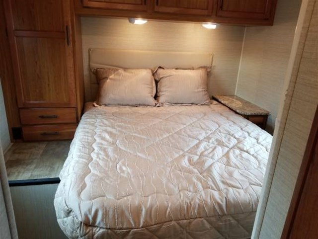 The rear bedroom is very spacious and has a comfortable queen bed, nightstand, and wardrobe. Easily close off the bedroom from the rest of the motor home with the accordion door for a bit more privacy.