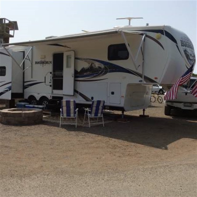 Triple Slide Bighorn Fifth Wheel w/Rear Living Area, Computer Desk & Ent. Center Slide, Hide-A-Bed Sofa & Free Standing Table/Chairs Slideout w/Storage in Chairs, L-Shape Counter, Double Kitchen Sink, 3 Burner Range, Refrigerator, Angle Shower, Private Toilet Area, King Bed Slide, Sink w/Med. Cabinet, Walk-In Closet w/Large Shoe Storage, Drawers w/Overhead, Wash/Dryer Prep and Much More!