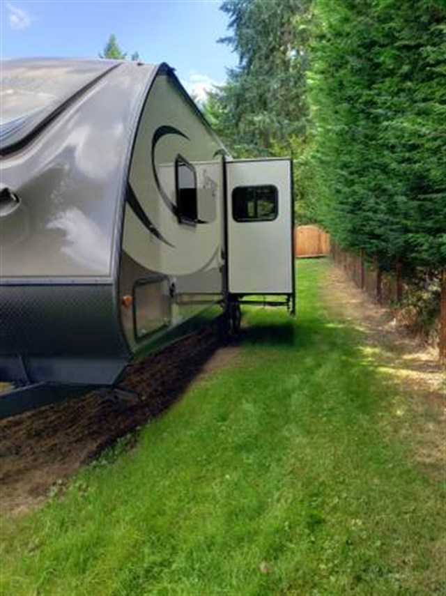 Approx 30 feet tip to tip. Sleeps 6. Rear kitchen with stove, fridge, microwave and pantry. TV and inside/outside sound system. Electric awning goes over both doors with LED lights. Walk around queen bed with storage above and both sides. Bathroom has shower with enclosure, large closet for clothes and towels. Gently used so all in excellent condition. Comes with stabilizer hitch, water and sewer hoses.