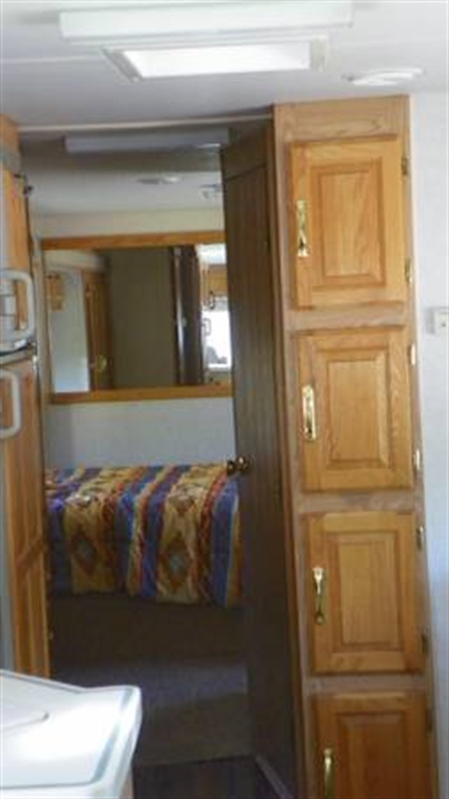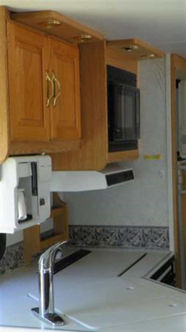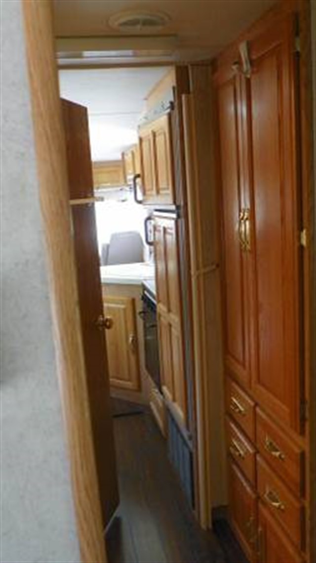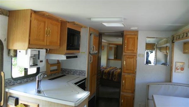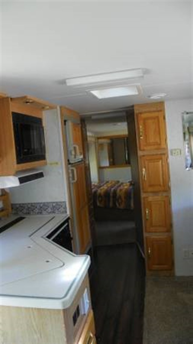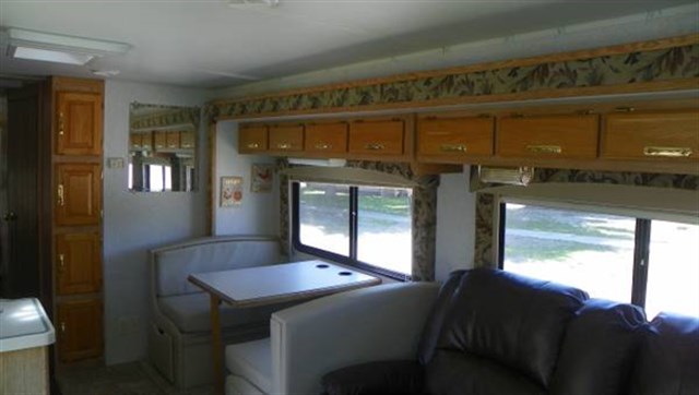 Step inside and take a look toward the back at all of the convenient features that would make any journey enjoyable. The kitchen area features a stove with microwave oven, and a refrigerator/freezer. There is also plenty of storage for all of your dry and canned goods. Enjoy comfortable dining at the dinette. Here you can enjoy your meals.