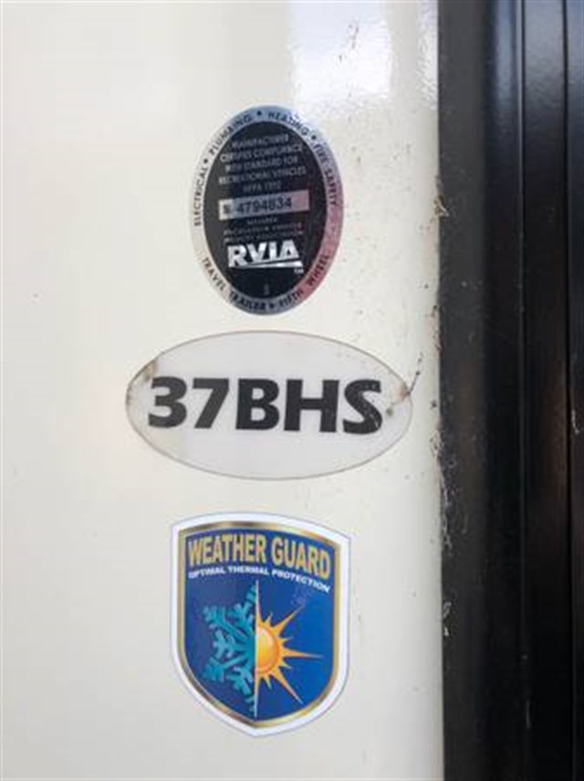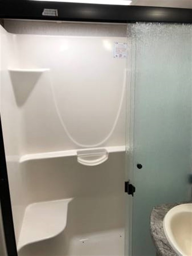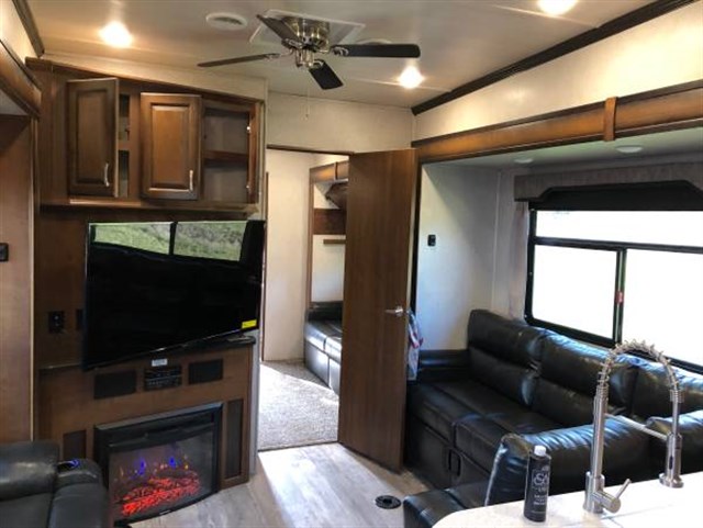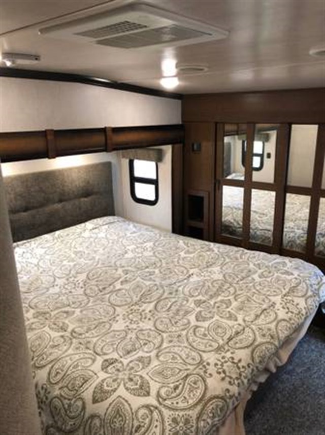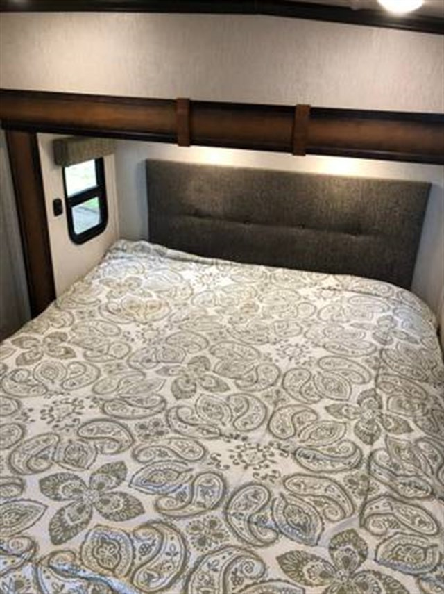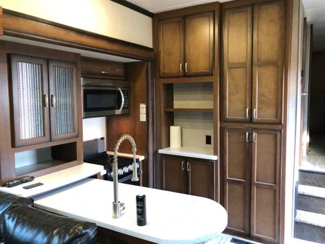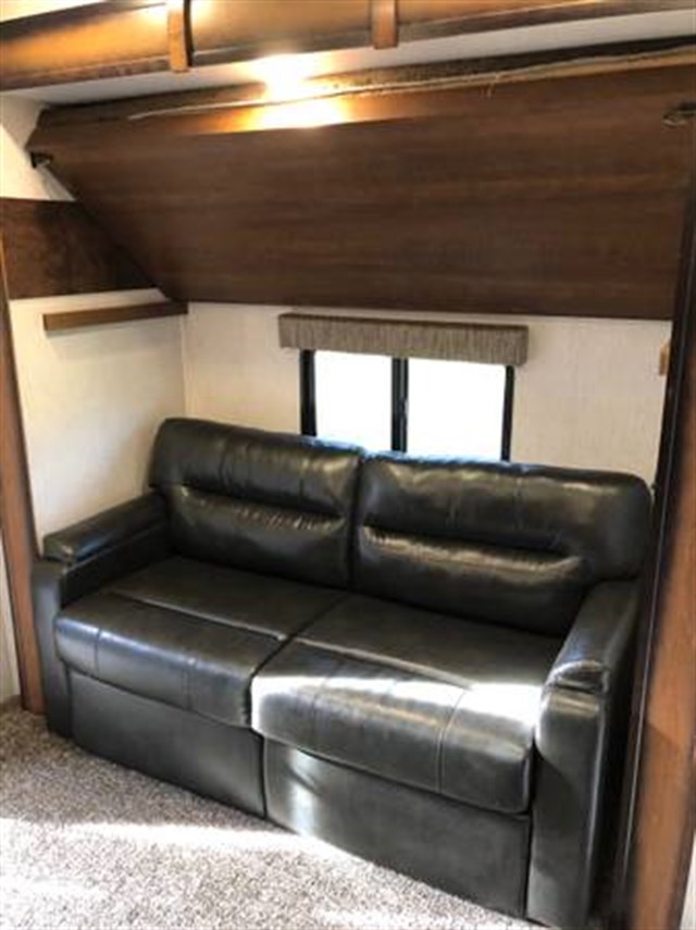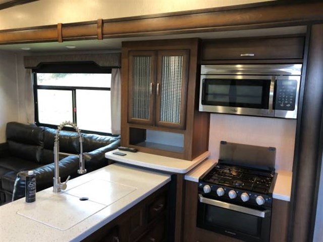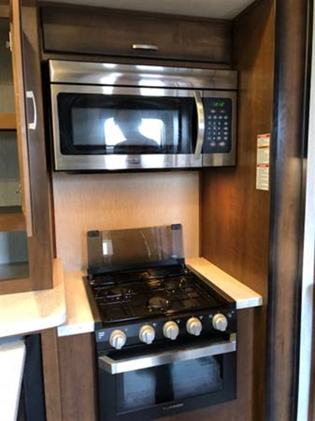 This beautiful fifth wheel also includes high gloss sidewalls, painted fiberglass front cap, aluminum framed & laminated sidewalls, tinted safety glass windows, F rated tires, sixteen inch aluminum rims, spare tire, EZ Lube Dexter axles, Nev-R-Adjust brake package, 6 point leveling, 2nd A/C with 50 amp service, universal docking station with black tank flush & exterior shower, heated & enclosed underbelly, slam baggage style doors, stop/turn/tail lights, twin 30lb. LP tanks, back-up camera prep, power awning W/ LED light, solar prep, MORyde Step Above, outside speakers with LED lights, 70" tri-fold sofa (38MB/38RSRT), and Winegard Air 360.