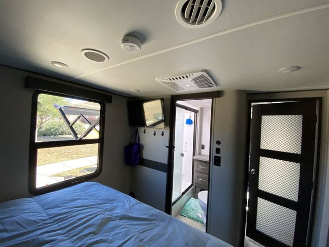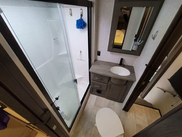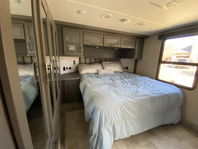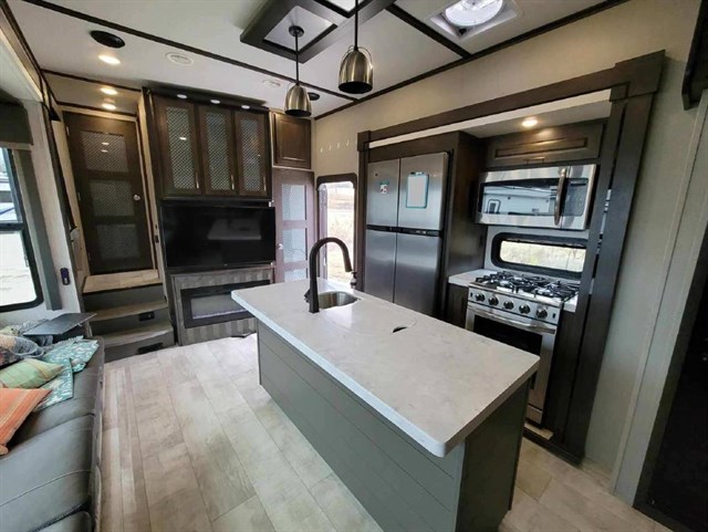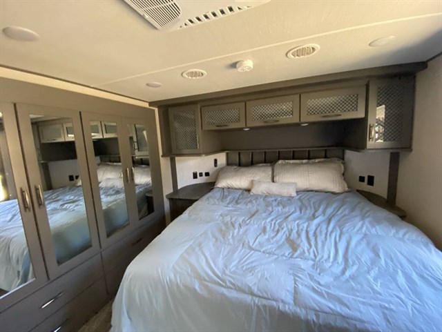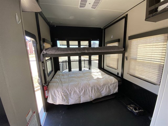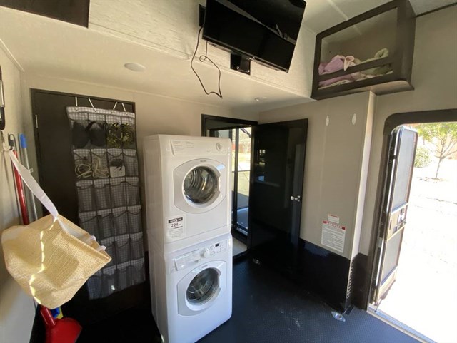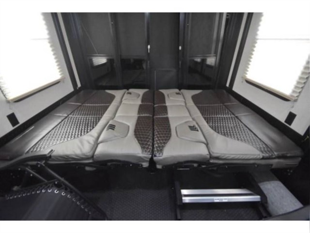 FEATURES: slam-latch baggage doors, frameless tinted windows, exterior security lights, and exterior entertainment center, 4 large screen TV’s with Roku built in, power patio awning with integrated LED lighting, generator, and self-leveling systemLuxury interior: LED ceiling lighting, blue LED accent lighting, the Mocha décor, and beautiful raised panel hardwood cabinet doors with hidden hinges. Deluxe kitchen with solid surface countertops, huge 18 cu refrigerator/freezer, 3-burner stainless steel stove top with oven below, and a 30” stainless steel microwave, and the double bowl sink with sink covers built into the spacious kitchen island.Super sofa with theater style seating for 5 to enjoy the LED HDTV on swivel arm located above the fireplace! Also located in the main living room is a twin-loft bed located above the garage that is accessible from the living room!King-sized bed with memory foam mattress topper pillow top mattress, large closet slide, tv and lots of storage.The 13’ garage plenty of space for friends and family with the Happi-Jac electric bunk system with removable sofas. Garage also has attached patio and half bathroom.Main bath: porcelain toilet, the one-piece fiberglass shower with textured glass door and built in shower seat, the freestanding decorative bowl sink, and mirrored medicine cabinet.