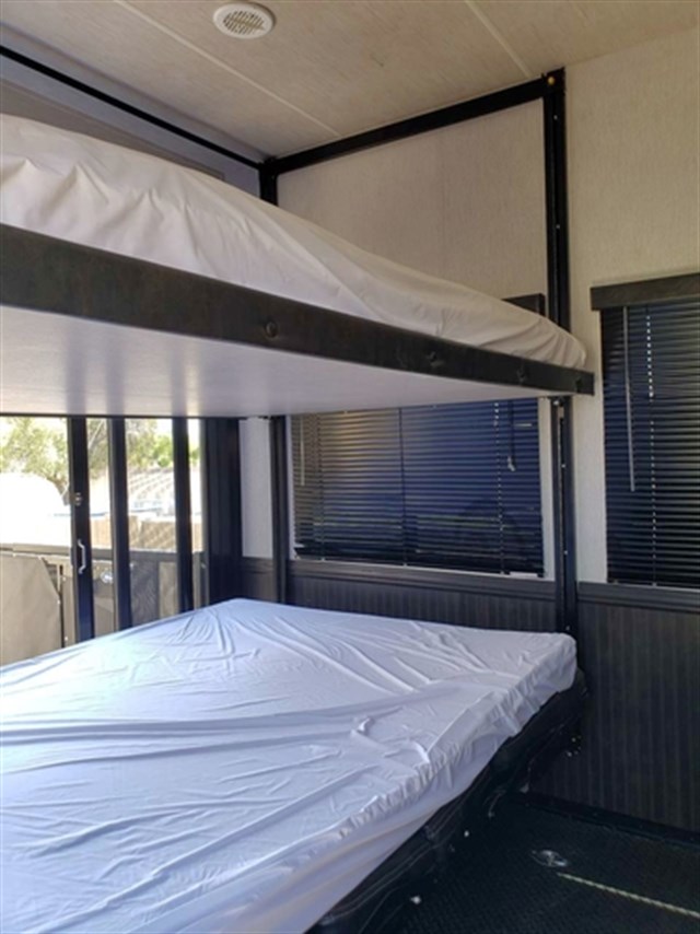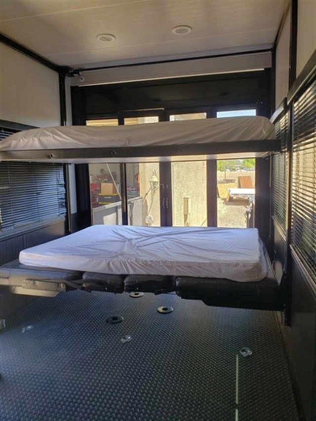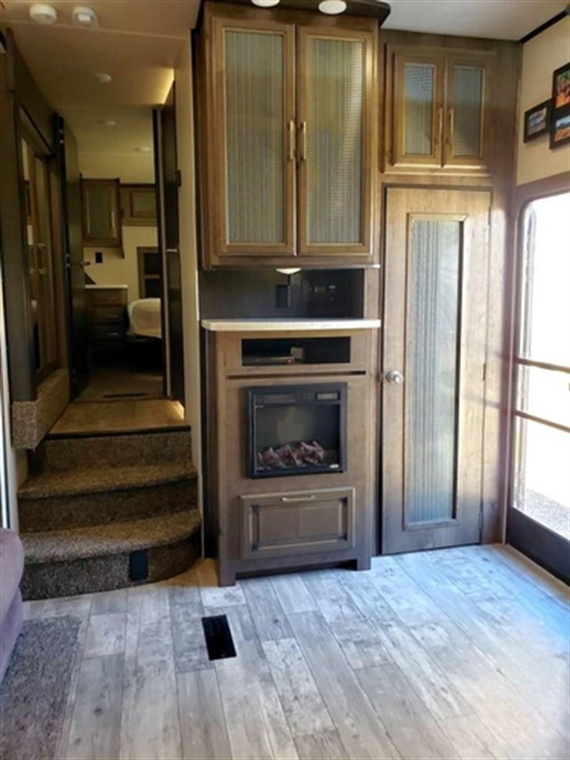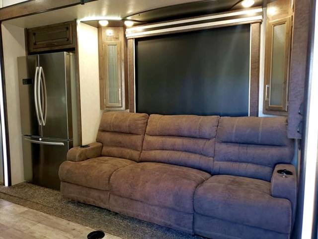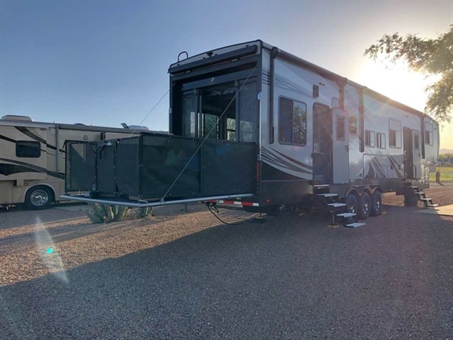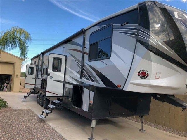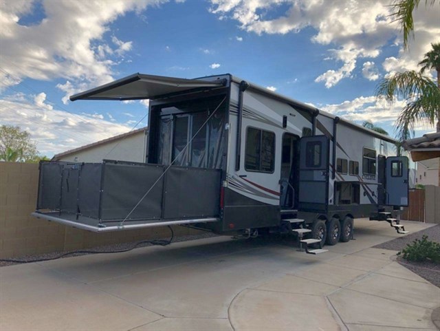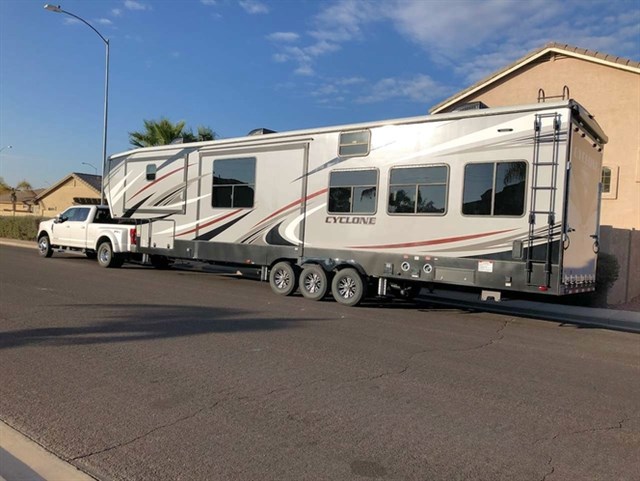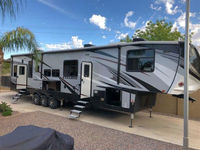 This 2018 Heartland Cyclone 4115 has triple axles that have been upgraded by reinforcing with cross braces, heavy duty shackles, and bigger U-Bolts. Installation done professionally by Straight Line Suspension. Wheel bearings recently packed. Other features are triple AC's, YETI Cold Weather Package, 23 CU FT Residential Fridge, Full bath with 1/2 bath in rear garage, rear ramp door patio, outside TV. Solar panel power by Go Power installed by Mesa RV with 37.5 Amp output. Batteries are only a year old. LED lighting inside and out and LED lighting on awnings.