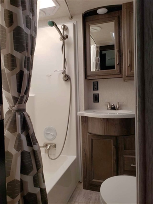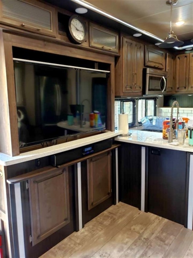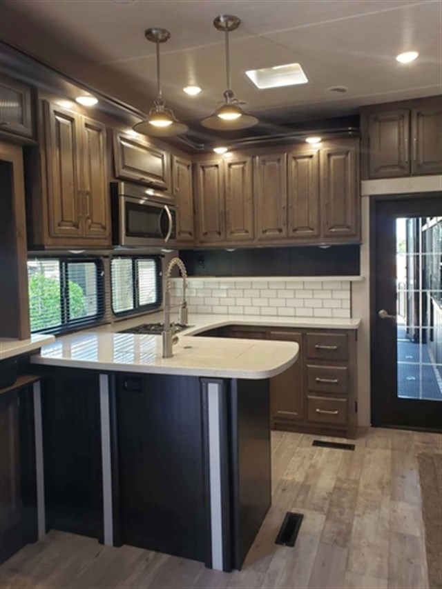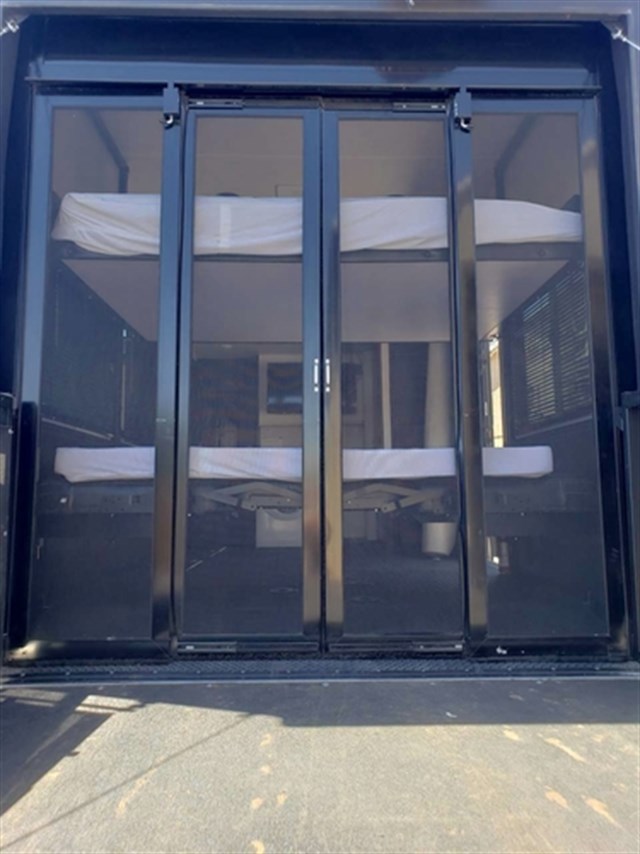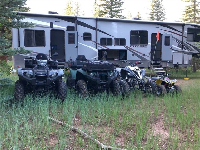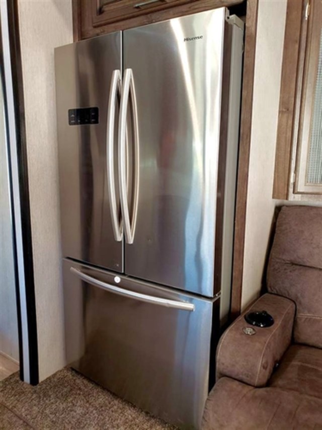 This 2018 Heartland Cyclone 4115 has triple axles that have been upgraded by reinforcing with cross braces, heavy duty shackles, and bigger U-Bolts. Installation done professionally by Straight Line Suspension. Wheel bearings recently packed. Other features are triple AC's, YETI Cold Weather Package, 23 CU FT Residential Fridge, Full bath with 1/2 bath in rear garage, rear ramp door patio, outside TV. Solar panel power by Go Power installed by Mesa RV with 37.5 Amp output. Batteries are only a year old. LED lighting inside and out and LED lighting on awnings.