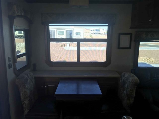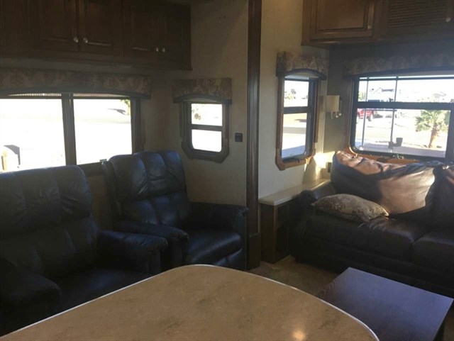 To the left of the entry door find a dinette for two with 4 chairs included along with two new recliners for relaxing and enjoying the entertainment center in the slide opposite. There is also a sofa with storage above including end tables that stretch across the rear of this coach.