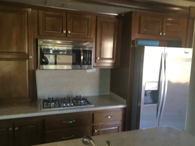 Next to the entertainment center in the slide opposite find lots of counter space, a two burner cook-top, and double door refrigerator with freezer drawer beneath. There is a counter area with large sink making prep work and cleaning up easy.