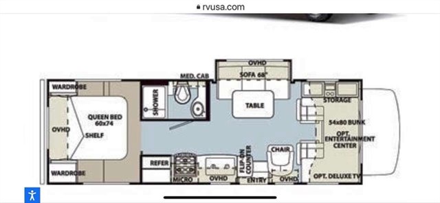 This RV is roomy with sleeping capacity for 6 with over cab bunk.
