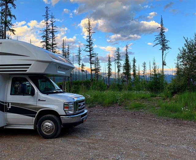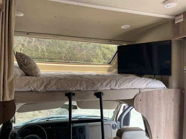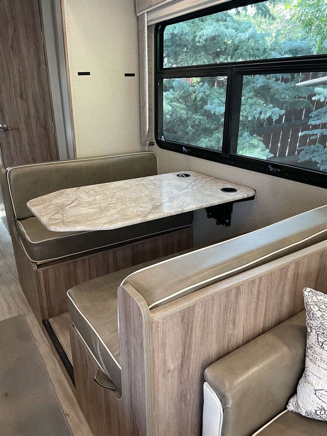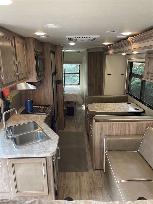 26 foot RV with 2 bump-outs is large enough to comfortably sleep 6, while compact enough to maneuver through cities, parking lots, and most camping spots. Relax in the thoughtfully designed, modern interior with plenty of windows to enjoy the majestic landscapes. Store your adventure gear in the 5 outside compartments. On rainy days, the interior living space provides comfort with a large tv, banquet-style dining, a couch, and plenty of storage for games and activities. A large skylight with motorized shade above the upper cab provides natural light and tall 7-foot ceilings make the space feel open. Power step, power awning, and outdoor tv add luxury to your outdoor camping experience.