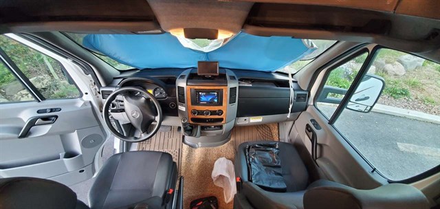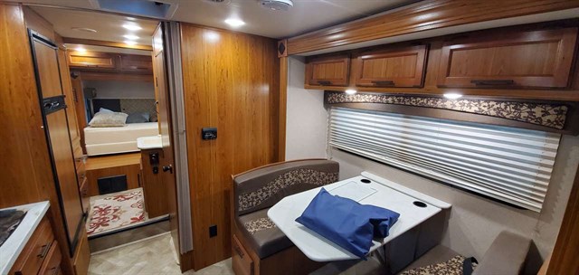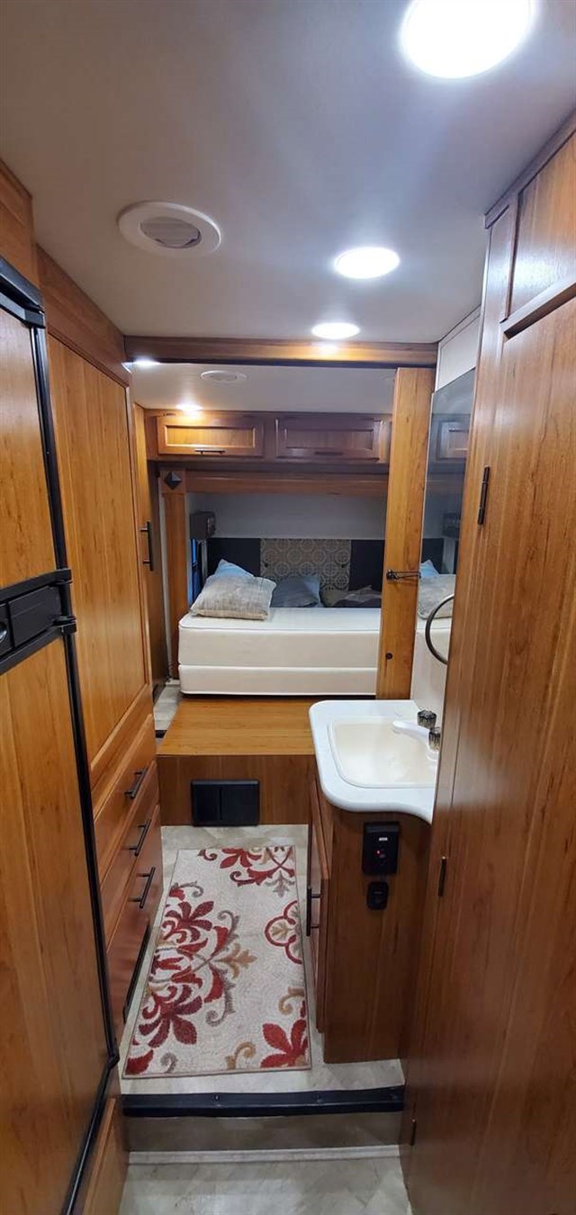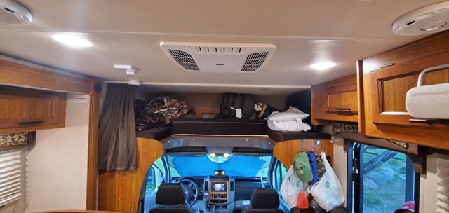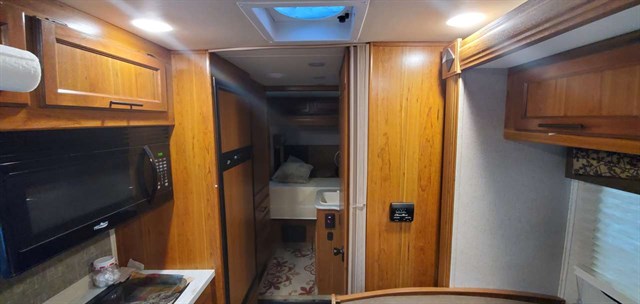 As you enter the motor home, to the right there is a 32" TV. Along the front cab you can find additional sleeping space with the cab-over bunk.