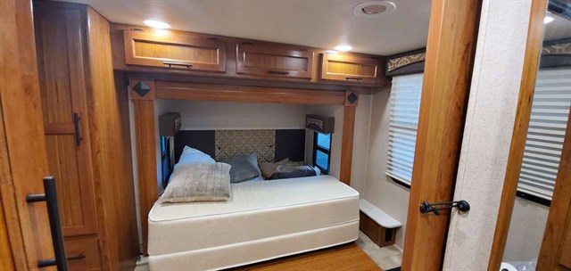 Retreat to the rear bedroom for a good night's sleep on the queen bed. You will find that the slide out helps to open up the floor space in the room. There is also a nightstand, and wardrobe. An additional wardrobe can be found at the foot of the bed, across from the bathroom sink.