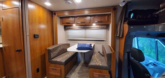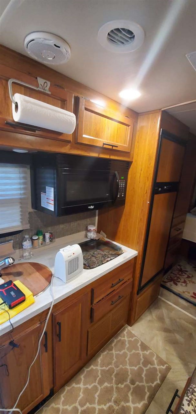 The kitchen area has a dinette slide out with an overhead cabinet. At night convert the dinette into a bed. Along the opposite side of the motor home find a flip-up counter, single sink, two burner range, microwave, overhead cabinet where you can store dishes, and an 8 cu. ft. refrigerator.
