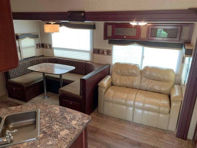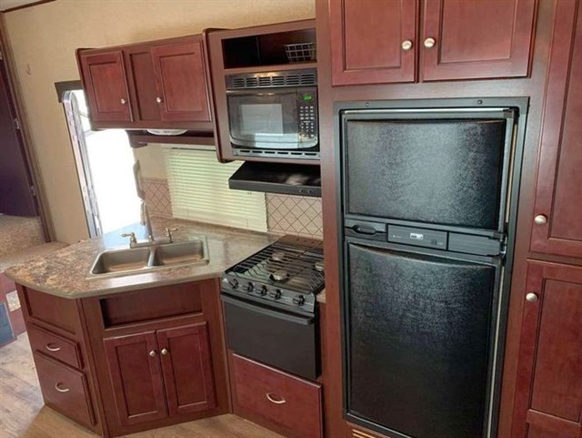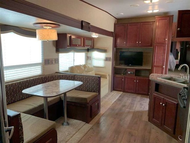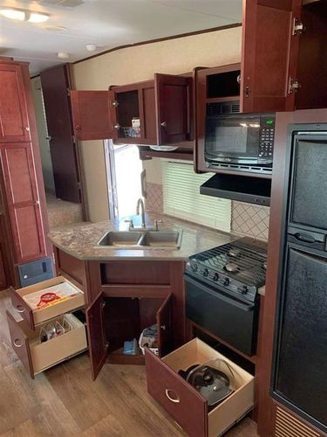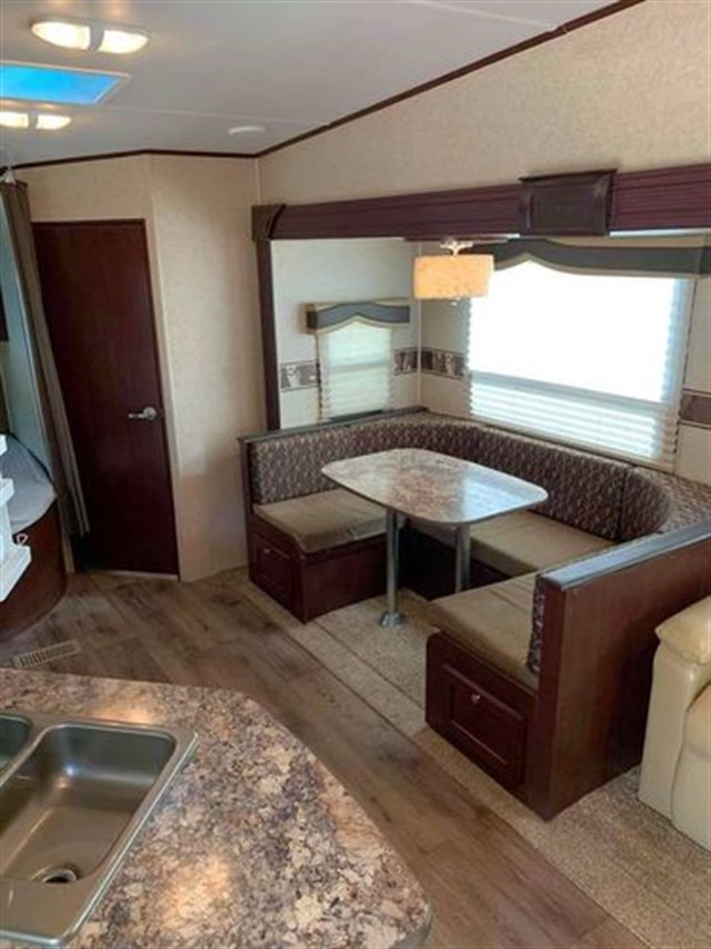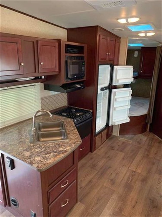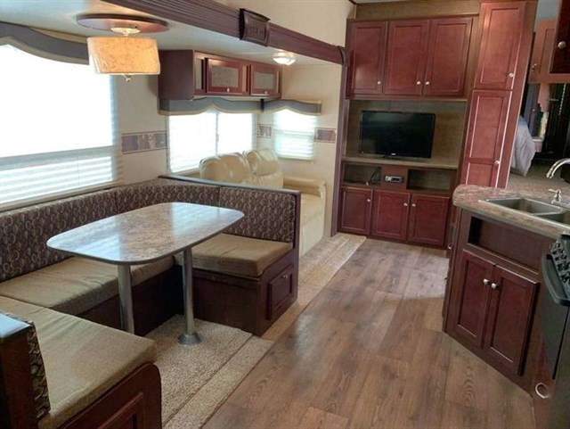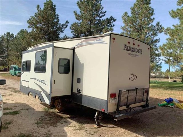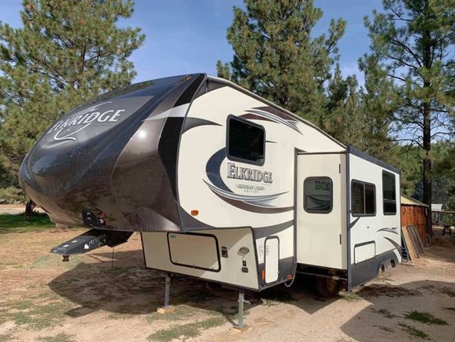 This ElkRidge Extreme Light offers the industry's first low cost 5th wheel priced like a travel trailer with all the features of a 5th wheel. The Heartland Elkridge Extreme Light model E26 bunk house features a U-shaped booth dinette & bunk beds. Options include exterior storage, correct track align system & sink covers. This beautiful fifth wheel also includes the ElkRidge EX Pearl & Plus packages which boasts gel coated molded fiberglass front cap, an 88 degree turn radius, Pearl high gloss exterior fiberglass, painted front cap, painted metal, upgraded graphics and Dexter Axles. Additional features include the Pinnacle Travel package: Bordeaux Cabinets, enclosed gooseneck with TPO, enclosed underbelly, spare tire, twin LP tanks, window blinds, Max Comfort style bedroom with bedspread, bedroom dressing area/full wardrobe, Forest Oak flooring, exterior shower, exterior speakers, AM/FM stereo with CD/DVD player, power front jacks, rear stabilizer jacks, large refrigerator, gas oven with range, stainless steel hardware, microwave, large grab handle, hidden hinges, water heater bypass kit and much more!