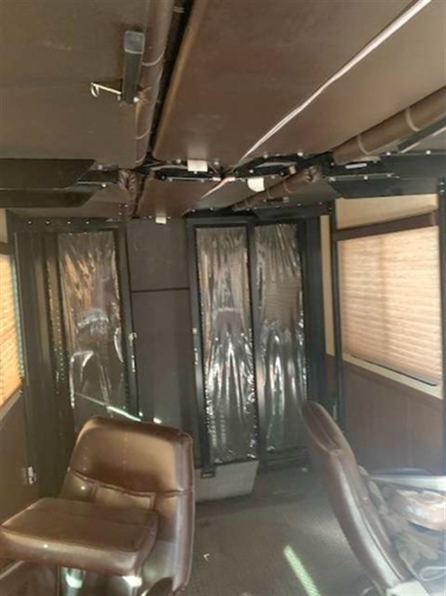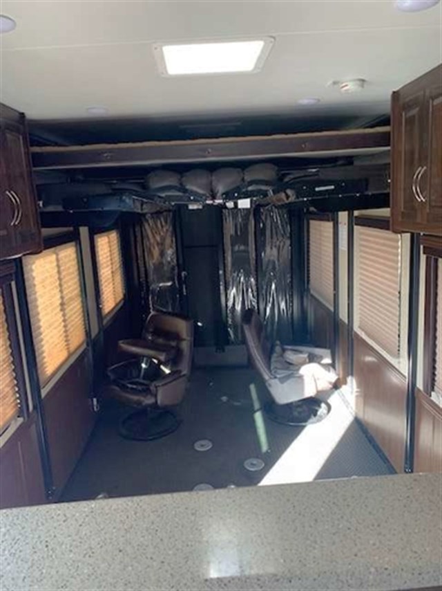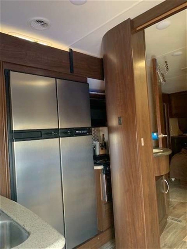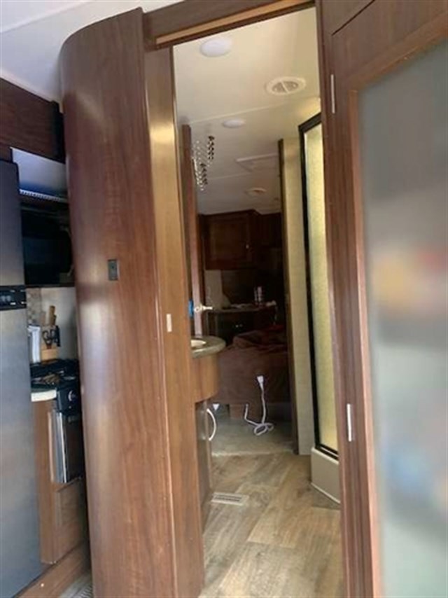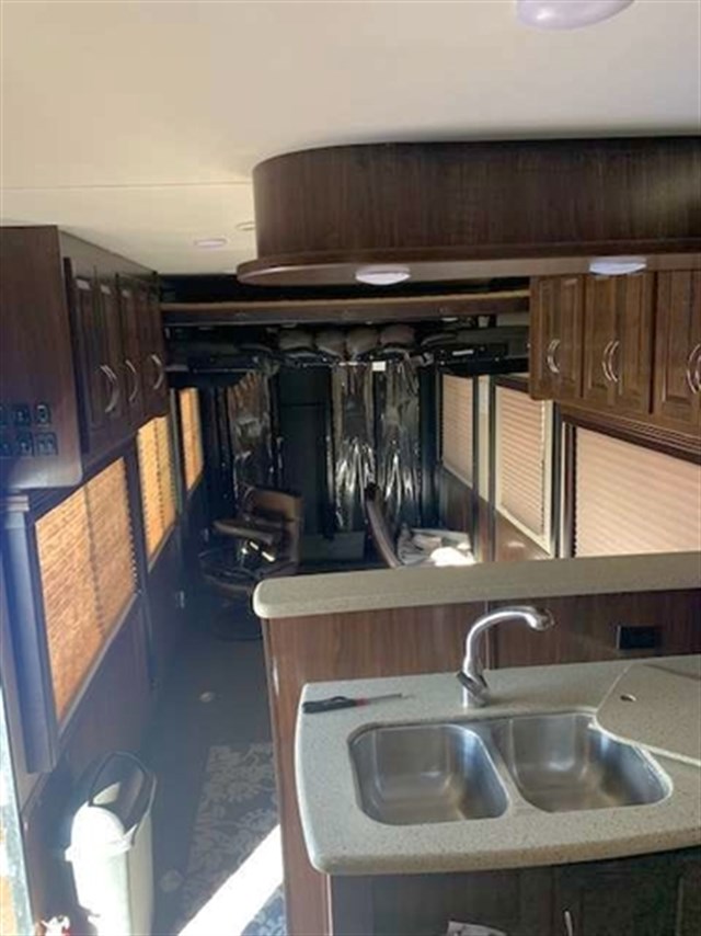 Enter the main living area where you will step up to a kitchen, and front bedroom and bath area. The kitchen offers a large counter top with double kitchen sink straight ahead of the entry door. There is a road side slide that offers a refrigerator, pantry, and three burner range.