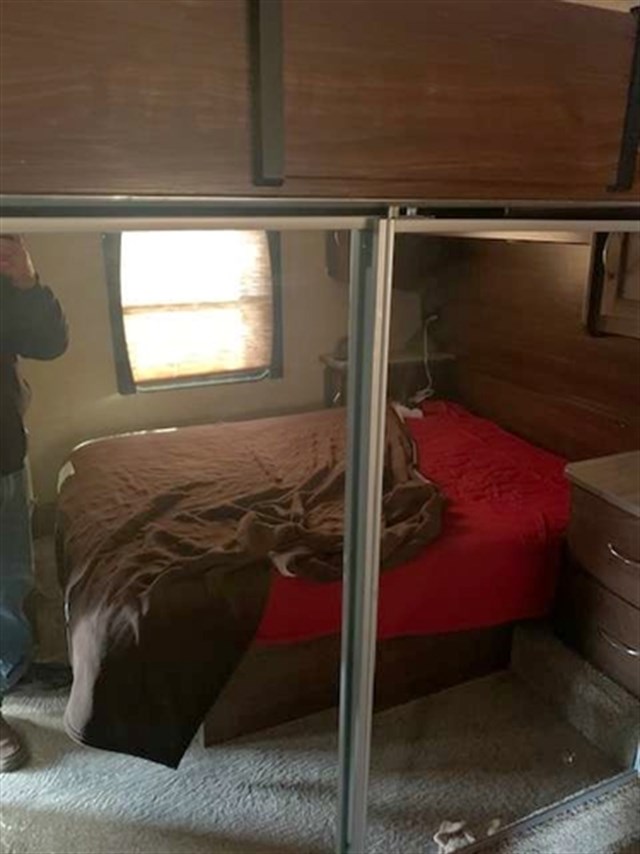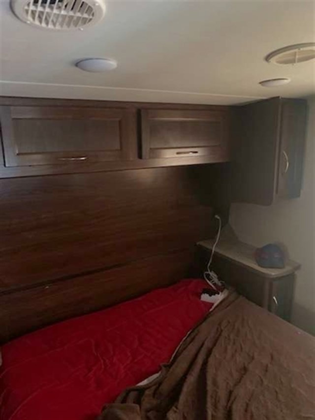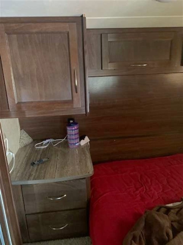 To the right of the entry door you will find a closet. Next, there is a bath with an angled shower, toilet and sink. Pass all the way through with a convenient second door to the front master bedroom which features a queen bed with storage on either side, and a slide out wardrobe with drawers, plus plenty of room to hang your clothes.