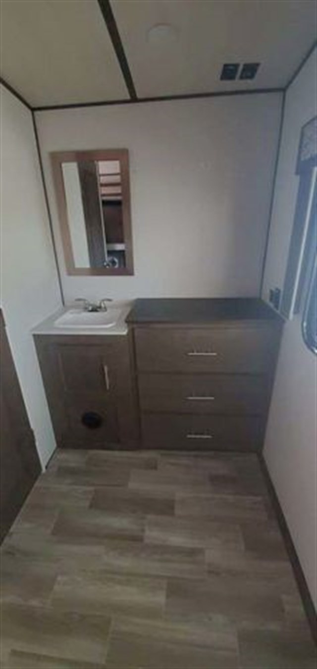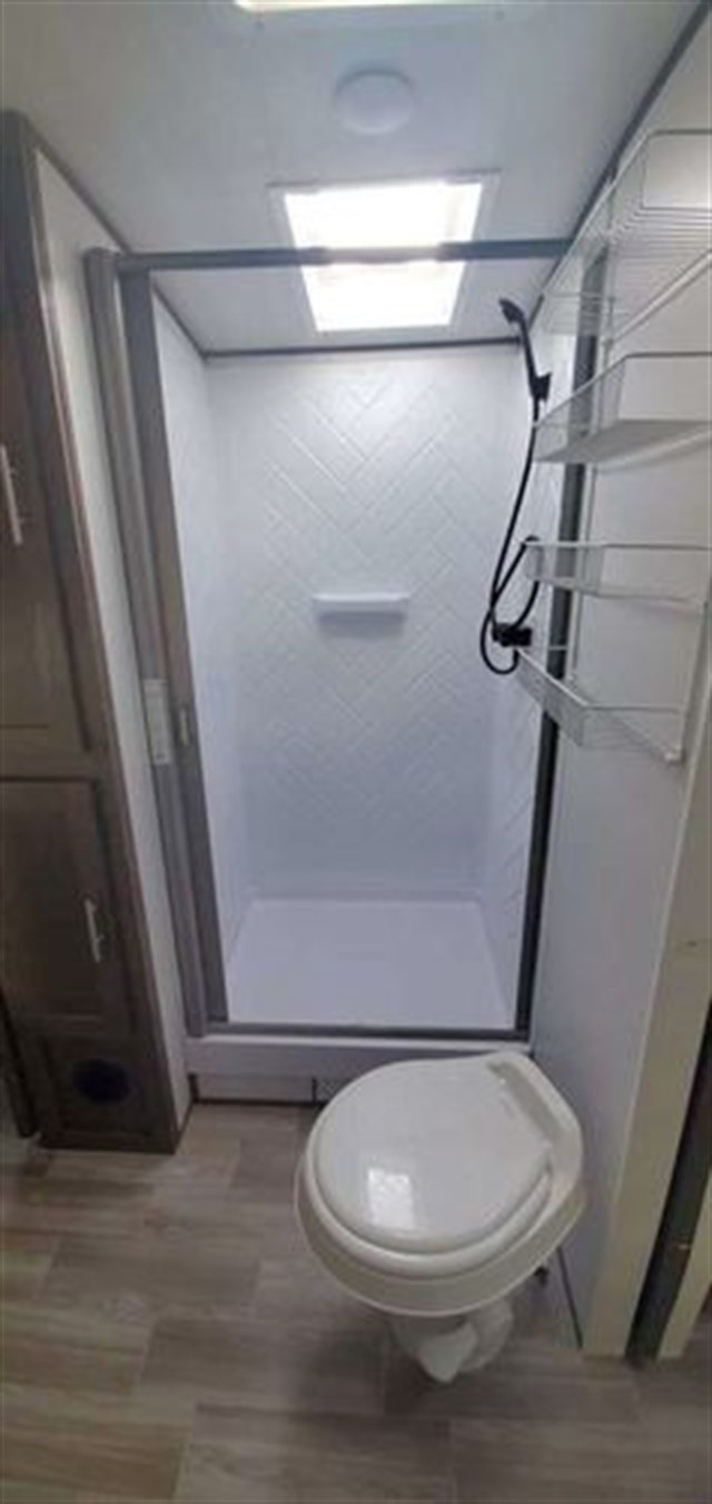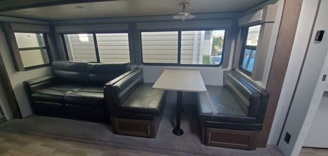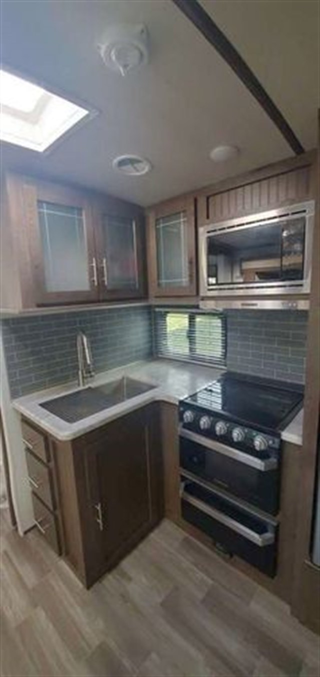 When you want time away from home, but yet want the comforts of home, then choose a Wildwood Heritage Glen LTZ travel trailer by Forest River. These models have plenty of residential features such as a stainless steel Dometic double door refrigerator, an under mount sink, stain resistant carpet in the living room and Beau plank wood linoleum in the kitchen. Along the exterior you will find an aerodynamic front cap with LED light strips, gel coated fiberglass exterior, and marine grade exterior speakers with a blue LED light. The One Touch electric awning provides plenty of shade and allows you to instantly have a nice outdoor living space and more!