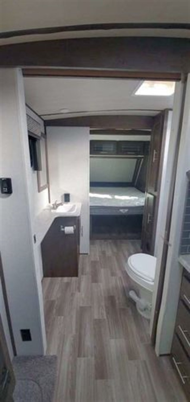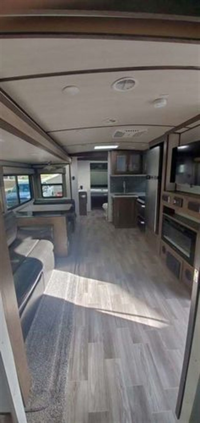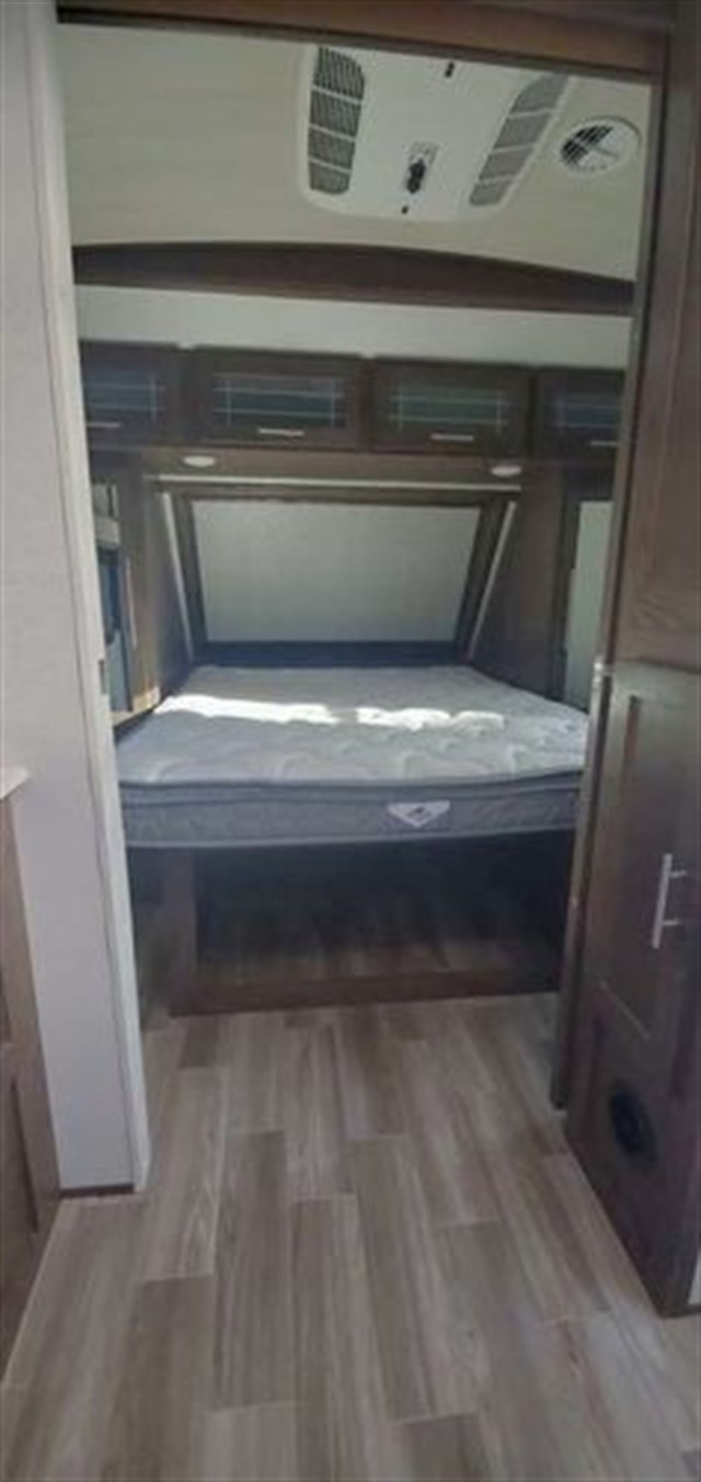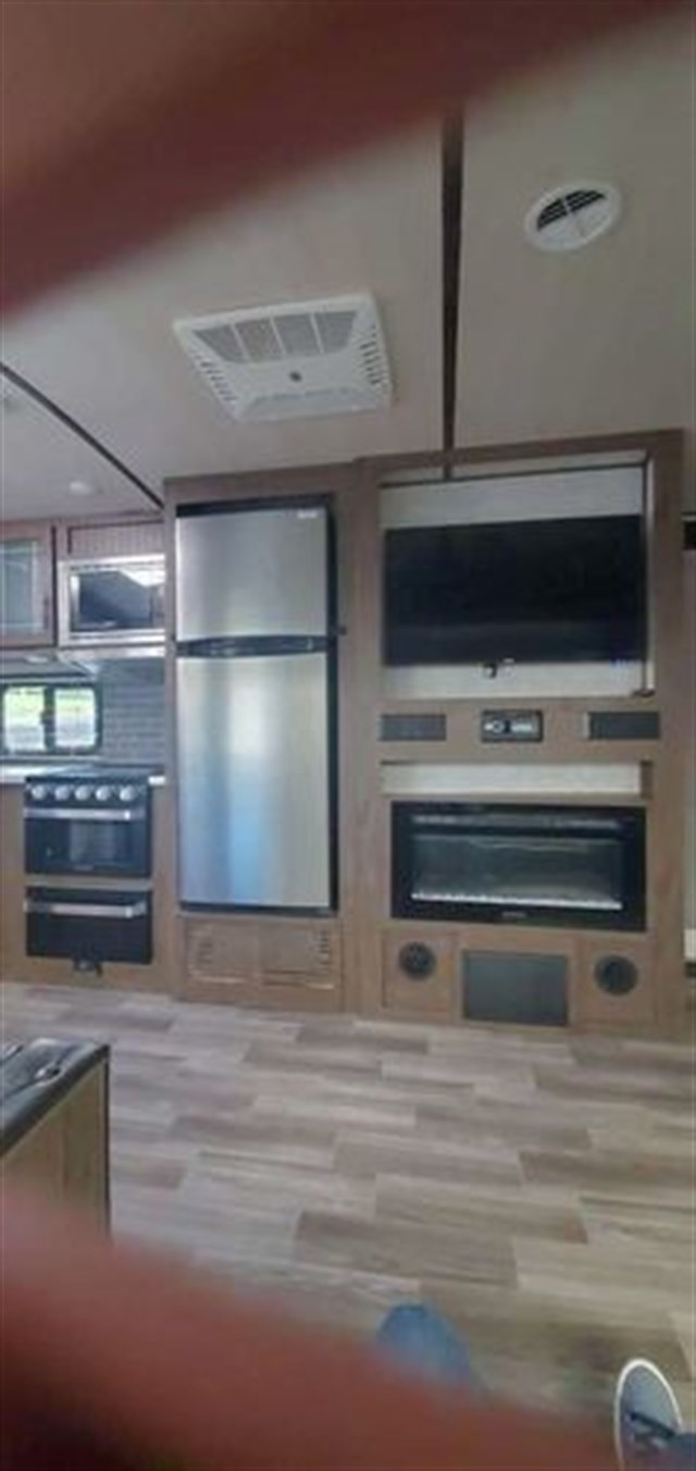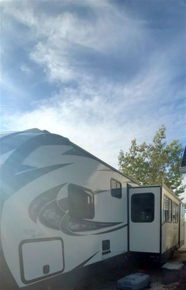 37 ft.Bumper pull Travel Trailer. Sleeps up to 9. 2 slide outs. 2 separate bedroom areas with 2 separate bathrooms. Back BR has couch/bed with under storage cupboard and bunk. 2 A/C units. Full kitchen includes microwave, refrigerator/freezer, oven. Electric Fireplace with heater fan and lights. Indoor/outdoor stereo system. 40" flat screen t.v.. Skylights. Walk in closet by entrance door for tons of storage. Crawl through storage space underneath front of trailer. 2 black tanks, 2 gray tanks. Large 20 ft. awning. Outdoor shower. Like new condition used for 3 months and has been stored since.