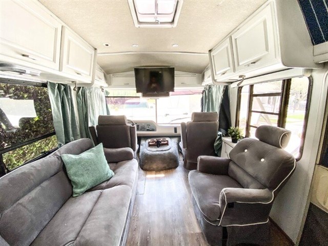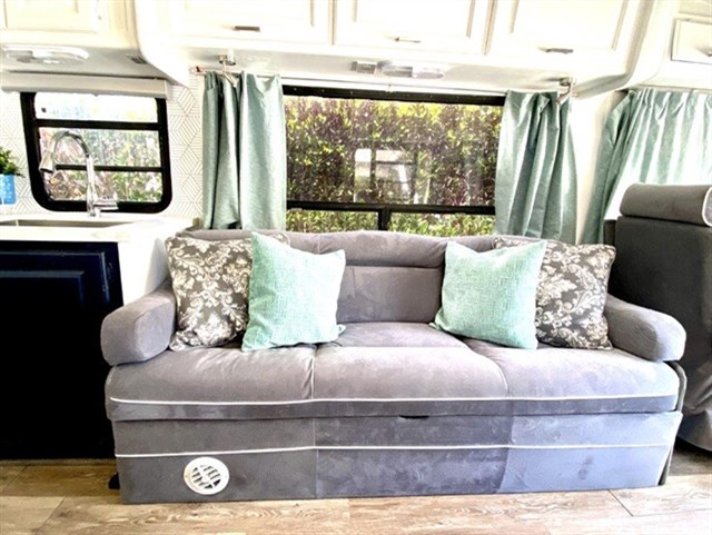 Interior: New Custom uphostery for all seasons and padding on 2 captains charis, pull out sofa bed, recliner, dining table. New Vinyl plank flooring with thermal padding. All new LED Recessed lights front and back with separate dimmer switches. New LED reading lights with built in USB chargers. All Cabinets are painted white and new nickel plated handles. New 24" 4K TV with sound bar and subwoofer for Netflix or Sports.