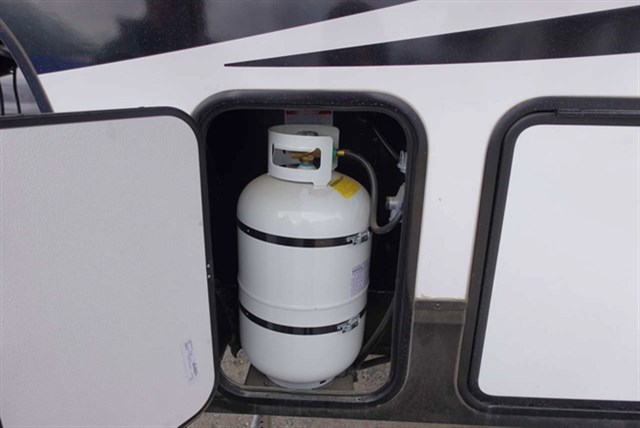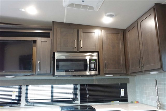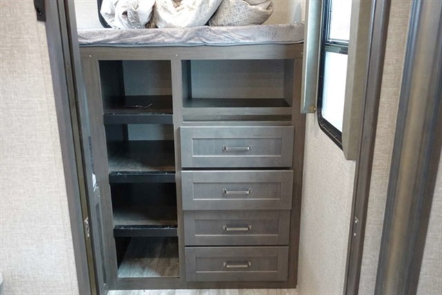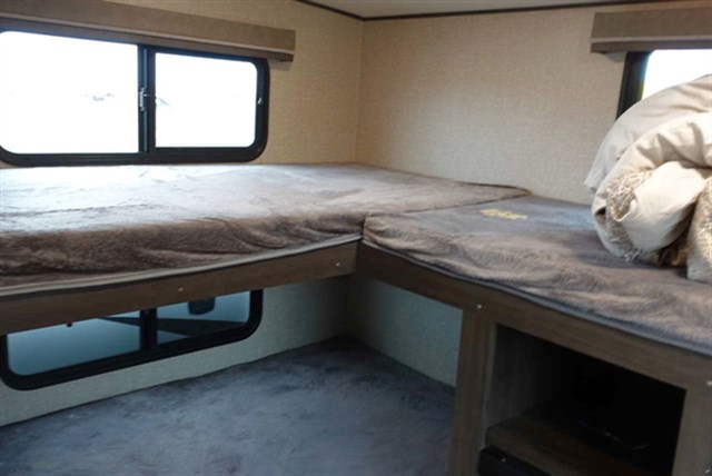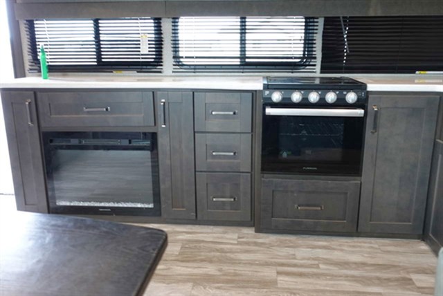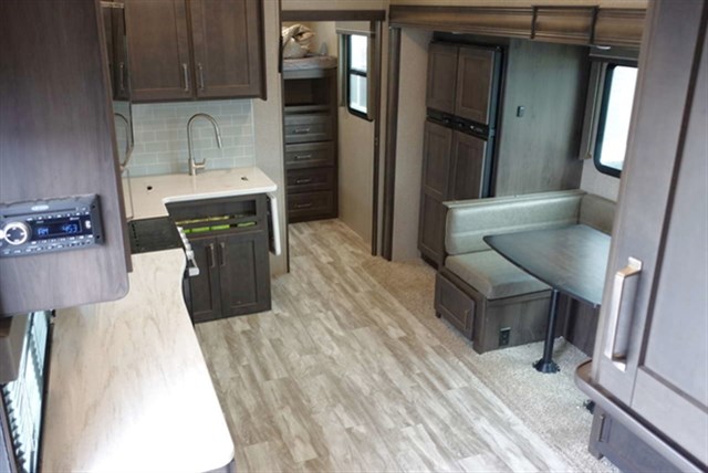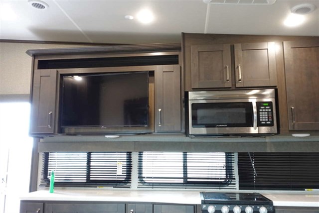 The whole family will love camping in this fifth wheel! The rear private bunkhouse has a 32" top bunk with a dresser below, a 34" top bunk above a 48" lower bunk, and is prepped for a TV to be added. The gourmet kitchen has a flip-up countertop extension to make meal prepping easier and a 12 cu. ft. refrigerator to keep your perishables fresh. The U-shaped dinette is big enough for everyone to gather around, but you can also choose to switch it out for the optional 78" theater seating instead. Above the fireplace is a 40" HDTV that you can move for a better view at the tri-fold sofa. The dual entry bathroom has a radius shower with a skylight above and an entrance that leads directly into the front private bedroom for your convenience!