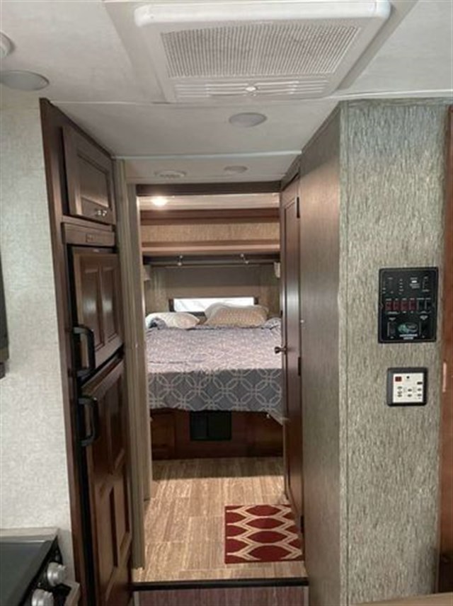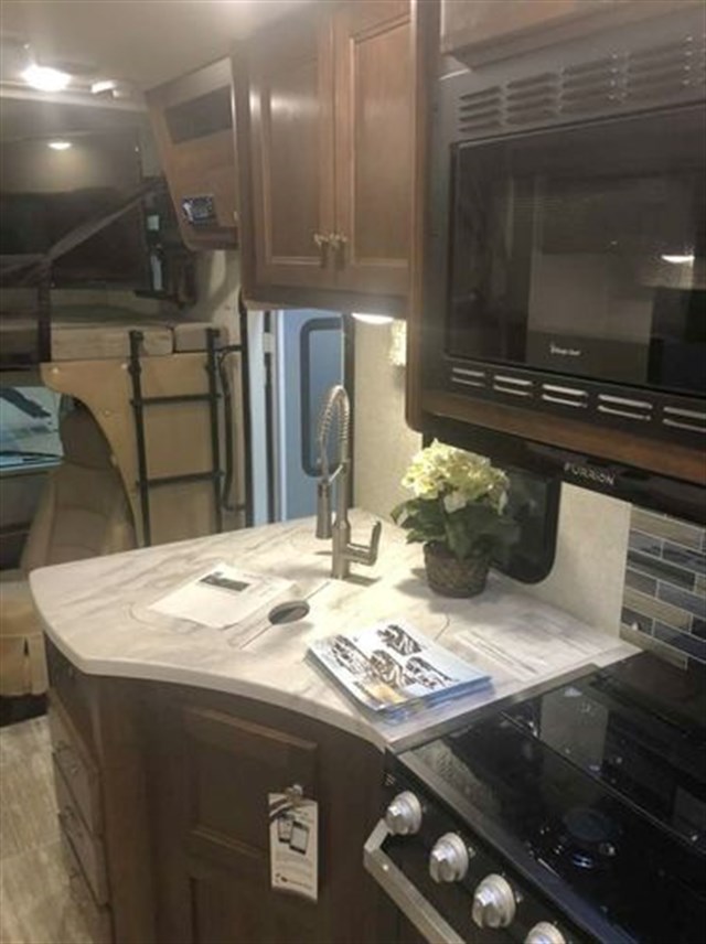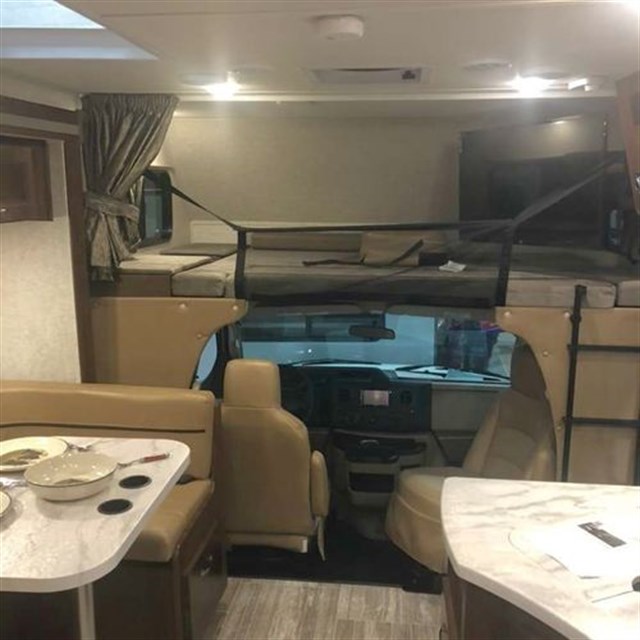 A Ford chassis carries this Sunseeker 2500TS offering ample space thanks to three slide outs. There is a 60" x 80" over the cab bunk that can sleep two individuals, the dinette can sleep two smaller individuals, and the queen bed can sleep two as well. So you can take this motorhome on a weekend trip and have plenty of space for your friends and their things. There is a slide out wardrobe in the bedroom and overhead storage throughout this unit. If it is a cooler day, there is an LED TV in the front for watching movies, and also a TV in the bedroom and outside as well!