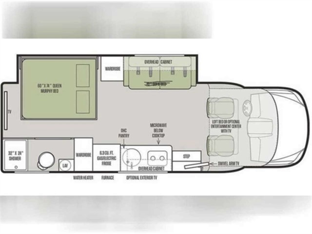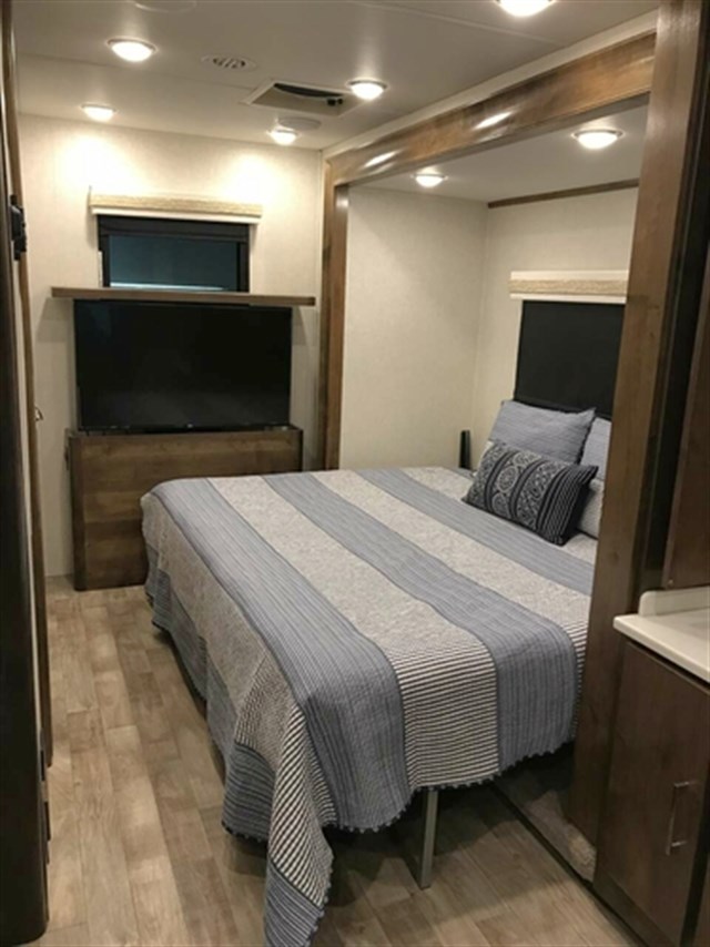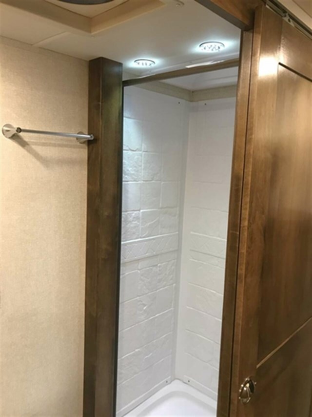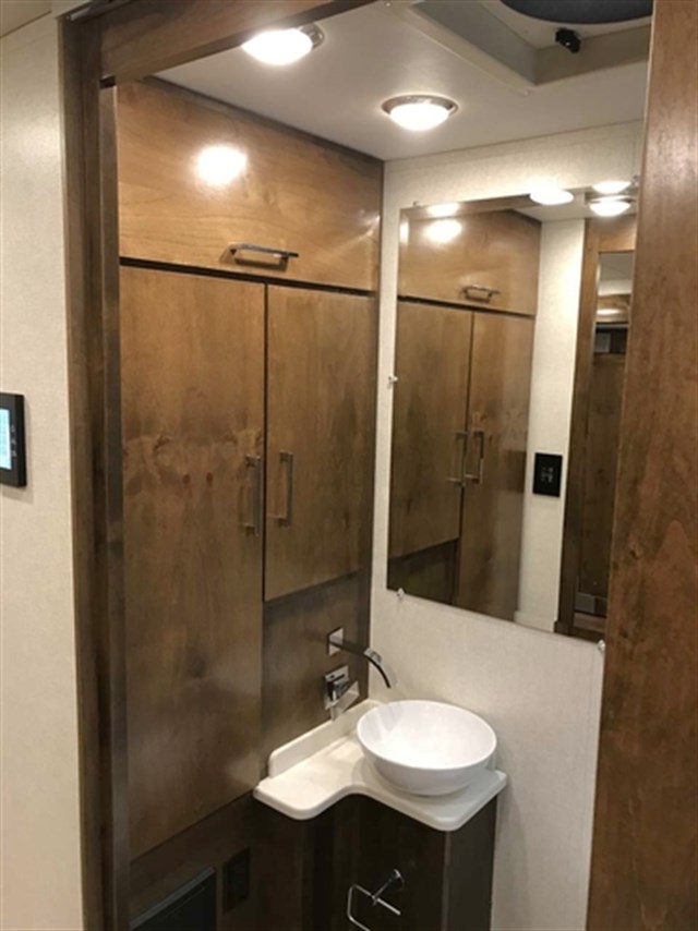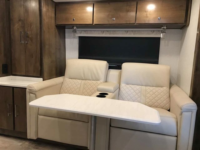 Self-Leveling Hydraulic Jacks. 15,000 BTU A/C with Heat Pump. Frontier Scheme Full Body Paint. Sandstone Interior. Russet Cabinets. Toscana Crema Leatherette. Exterior LCD TV. Bedroom TV. Theatre Seating. Overhead Entertainment Center. Trauma Comfort Plus Tankless Water Heater. Windshield and Cockpit Night Shades. Alcoa Stainless Steel Wheels. Solar Prewire. 3200 Watt Diesel Generator.