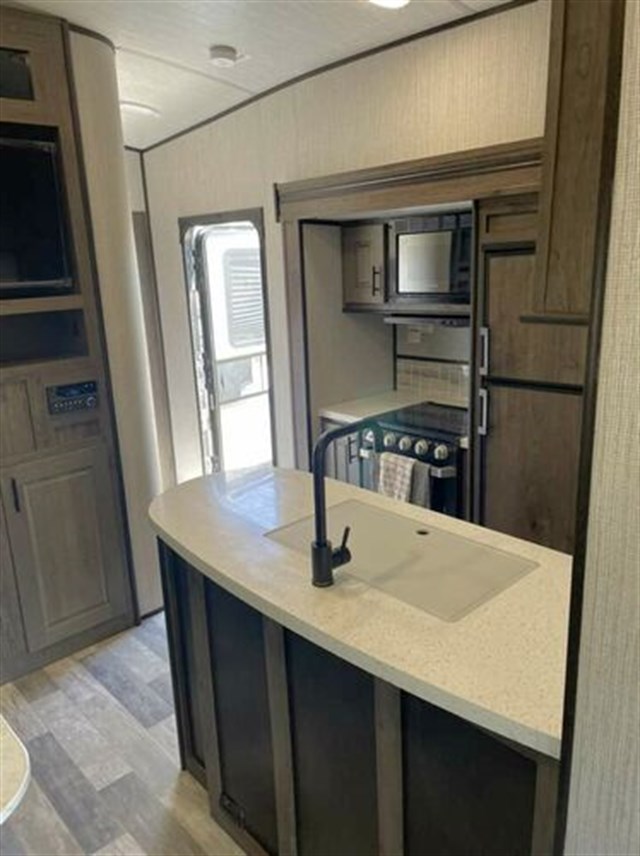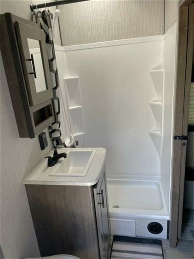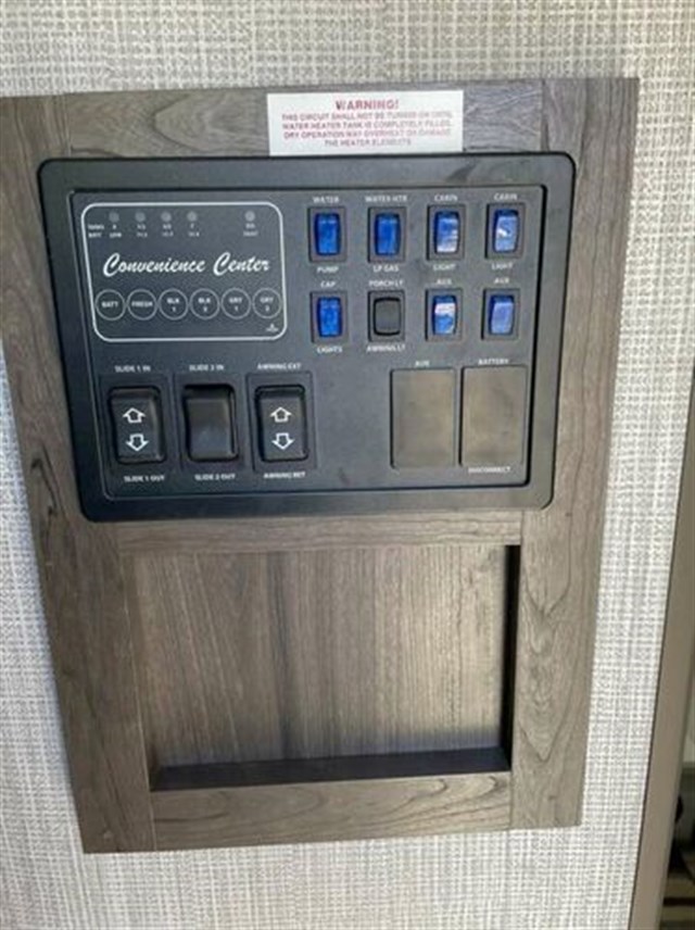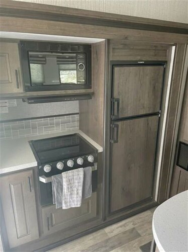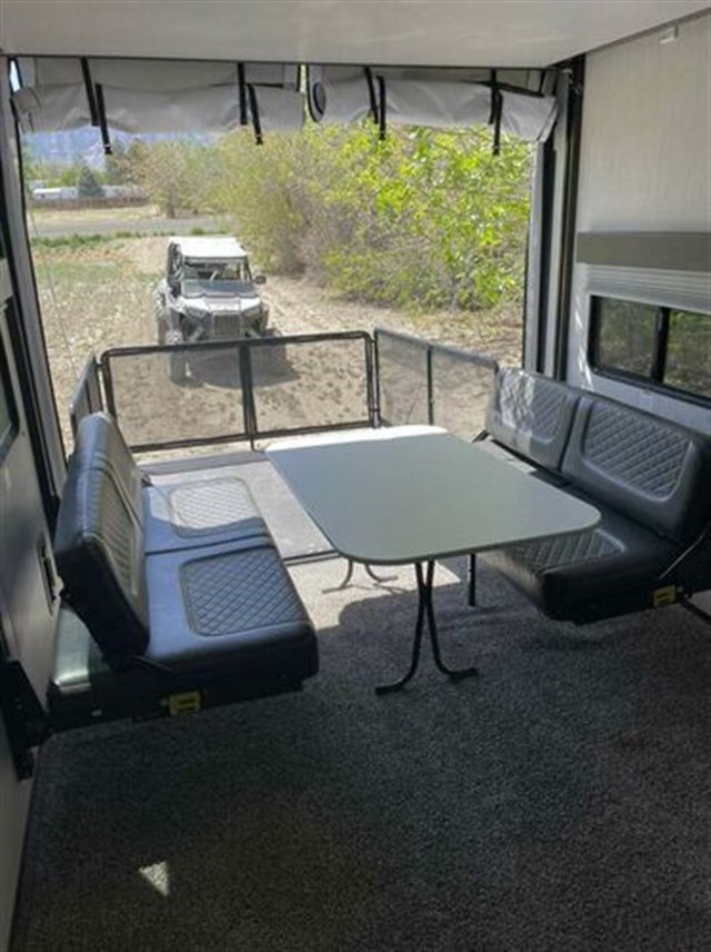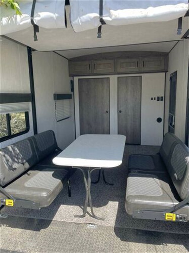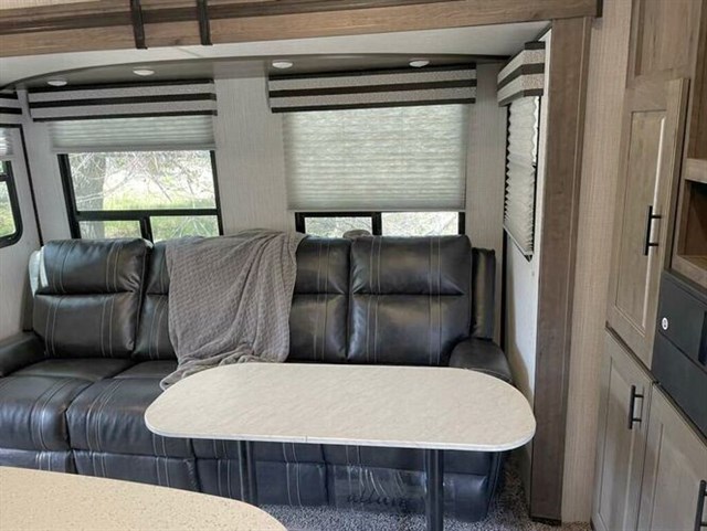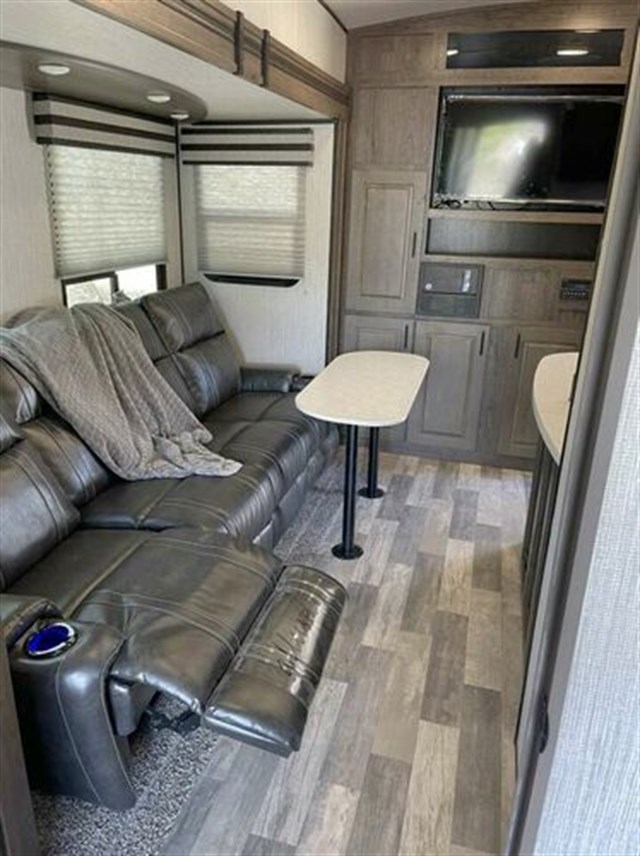 You will appreciate the interior floor space provided by the two slides which really open up the living/kitchen area, and the master suite has a private entry into the bathroom for added convenience at night. With a 12' 6" separate garage for your toys, you can choose to store them while you are parked or unload them and use the space for the electric queen bed and opposing sofas below that will help you sleep eight people comfortably.