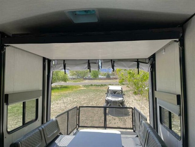 This is an amazing trailer. The garage converts into a room with carpet and 2 seats that turn into a queen size bed, as well as a bunk bed above it.