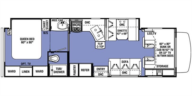 The living and kitchen areas feature a sofa with overhead cabinets, a two door refrigerator or optional four door refrigerator, and a pantry along one wall. The opposite side has an L-shaped kitchen countertop with three burner range, overhead microwave and cabinets, angled double kitchen sink and a flip down countertop extension. There is also a dinette with overhead cabinets.