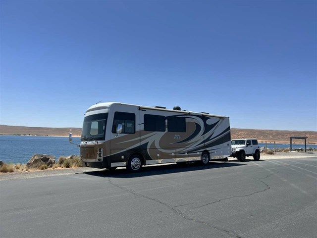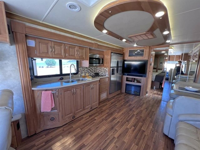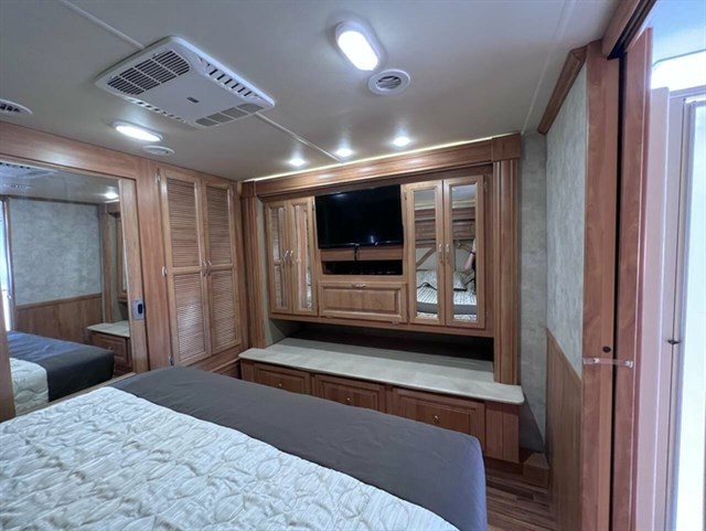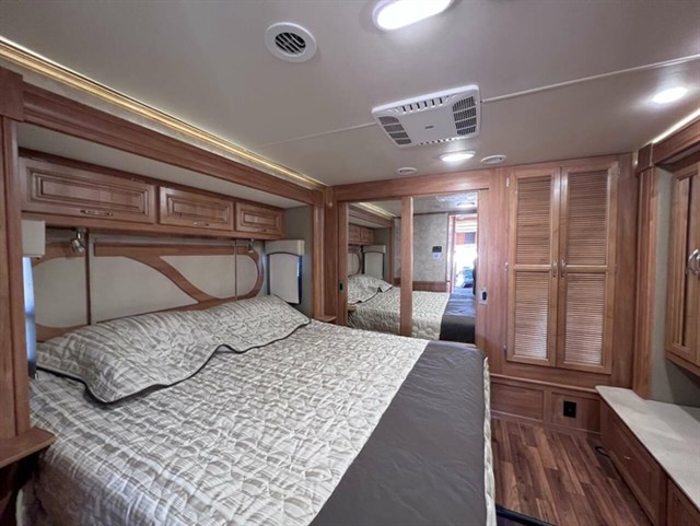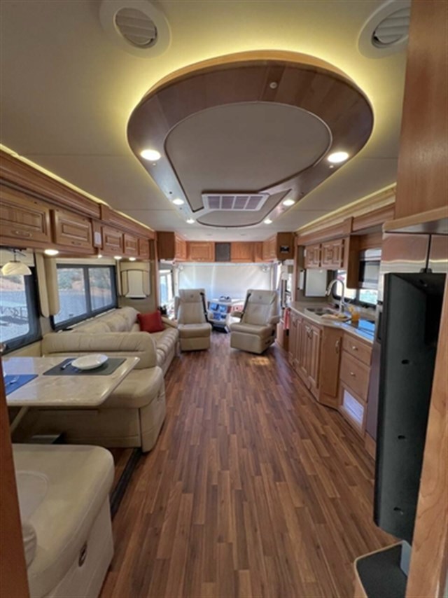 Has 4 slides, 100 gal fresh water tank,50 gal gray tank, 50 gal black tank, 100 gal fuel tank, 13 gal propane tank. 2-15,000 btu heat pumps. 2 Propane furnaces, tankless water heater. 2 basements with rollout slides. Cummins 360 hp with Allison Transmission.