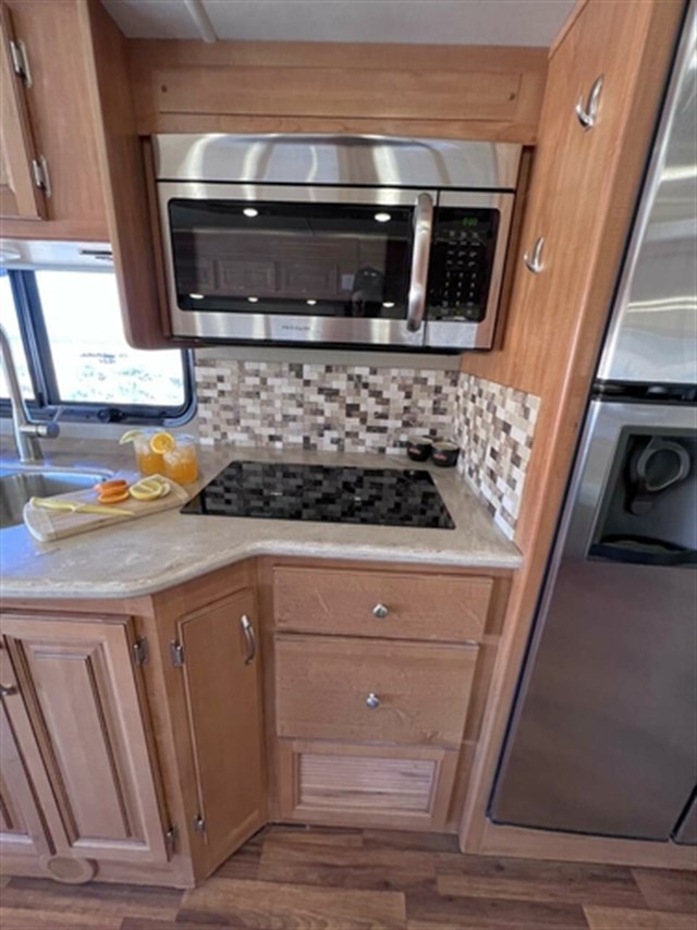 The curbside slide features the kitchen amenities. There is a sink, counter space, two burner induction cooktop, convection microwave, and a refrigerator. The opposite slide out includes a sofa and booth dinette. Both slides provide overhead storage for your dishes and things. You will find an LED TV and fireplace along the interior wall allowing easy viewing from this combined space.