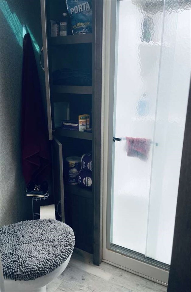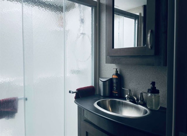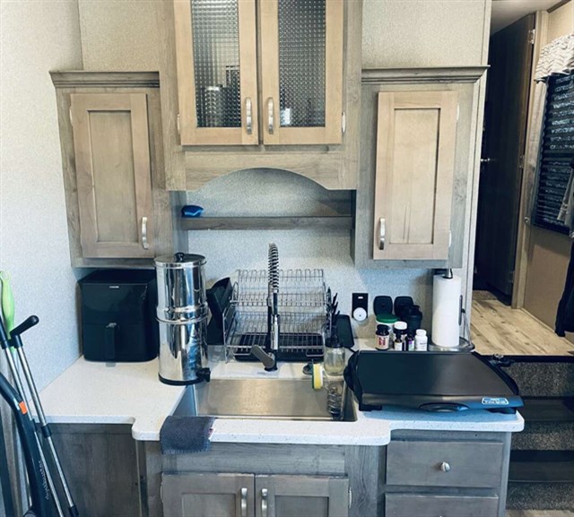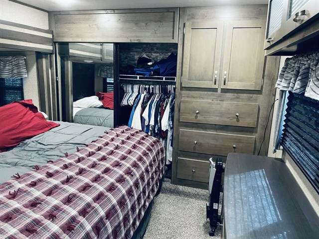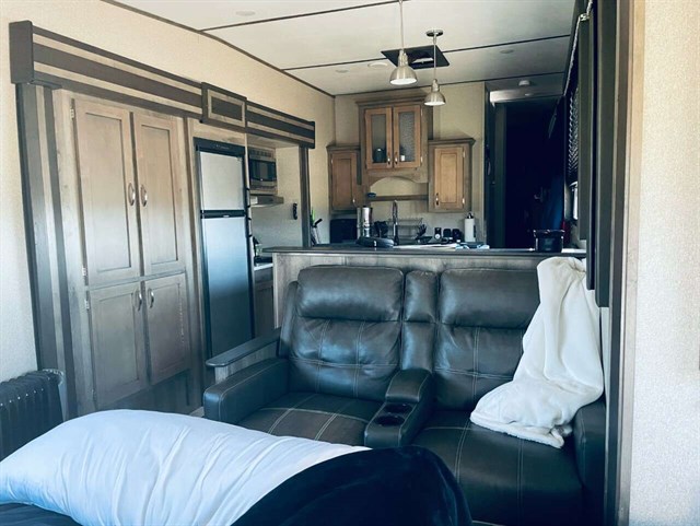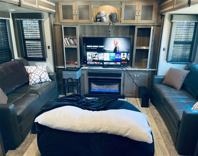Large living room that will seat 7. Lots of storage in the kitchen, dual air conditioners, electric fireplace, king sized bed, porcelain toilet with handsprayer, hookup for washer/dryer, outdoor awning with speakers.