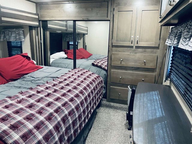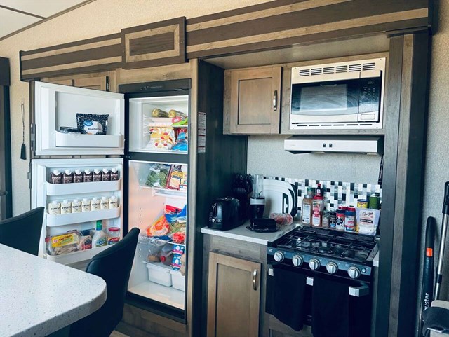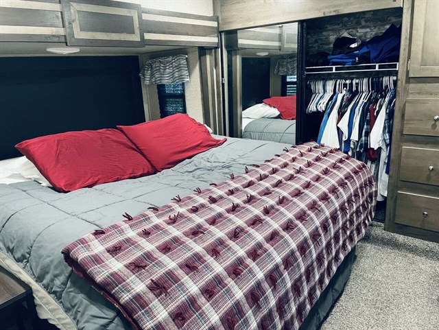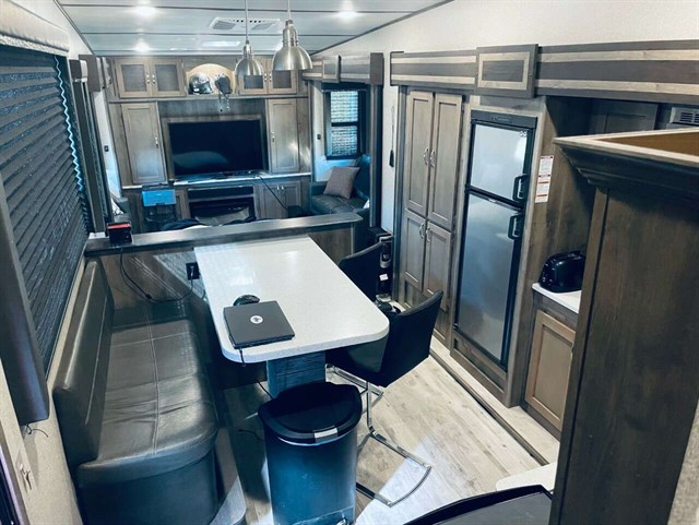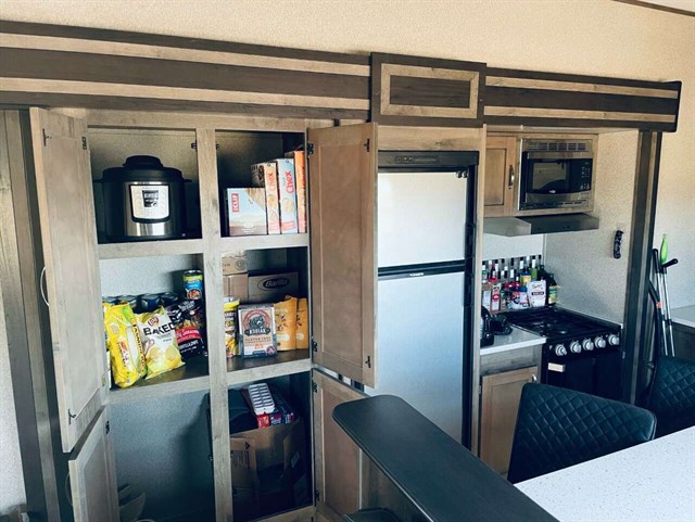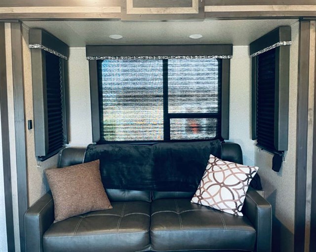 Imagine entertaining family and friends at the campground on a rainy day or even under the awning on a beautiful camping day. You will find yourself hanging out in the rear den with a full wall HDMI entertainment center including a 50" HDTV and a fireplace. There is a spacious kitchen just behind the reclining theatre seating with full appliances to make any meal, including a double door 8 cu. ft. refrigerator to store leftovers, and plenty more at-home conveniences such as the choice of bench or chair seating at the dinette. The master bedroom will treat you like a king, plus you might even choose to add a washer and dryer option if you plan to stay for awhile.