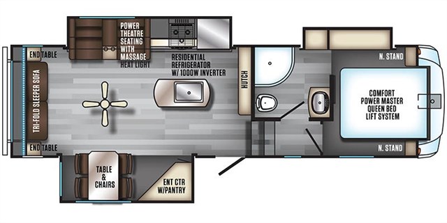 From its automatic leveling system to its 6' 4" slides with oversized panoramic windows, this fifth wheel by Forest River provides luxurious conveniences at an entry level price point. This structure has been designed so that even light duty trucks can tow it, yet the interior portion is still packed full with high-class amenities that will enhance your traveling experience, like the high circulation ceiling fan that adds to the character and functionality of the living area. Not only will you be thoroughly impressed with this RV, but so will everyone else that sees it because RV Pro has awarded this Arctic Wolf their "Best of Show" title.