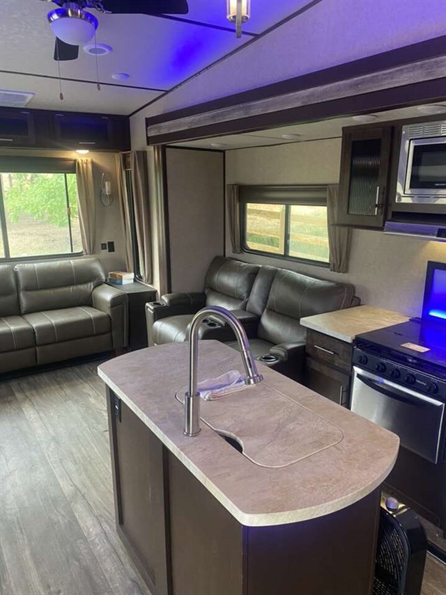 If you are searching for a spacious RV that will meet all of the standards you are accustomed to in your own home, then this Arctic Wolf fifth wheel is the unit you have been looking for. With its private master suite, this trailer gives you the feeling that you are in your own bedroom because of the comfort and seclusion it provides, and this trailer's capacity to sleep four people means that you don't have to travel alone. You will look forward to every day's meal preparations because of the walk-in pantry and kitchen island which help you to cook dinner effortlessly each evening.