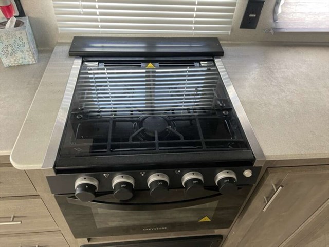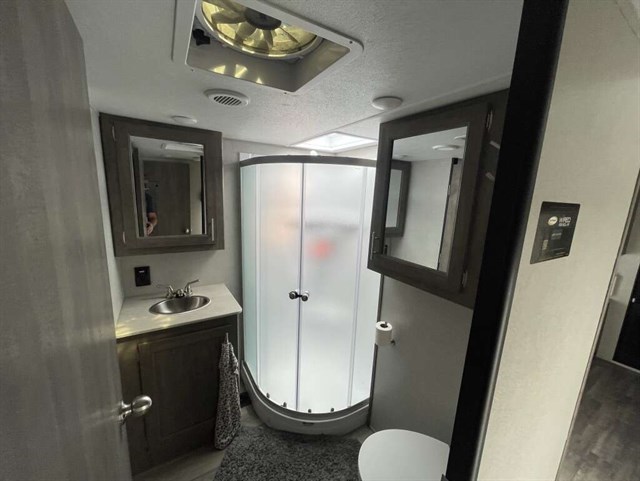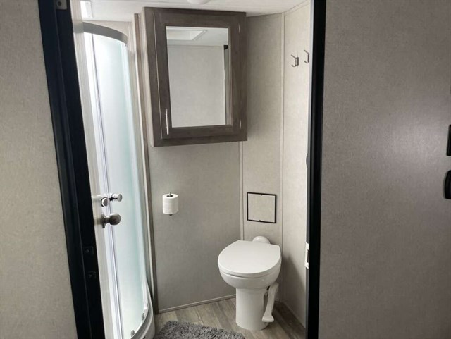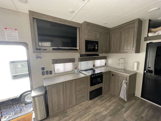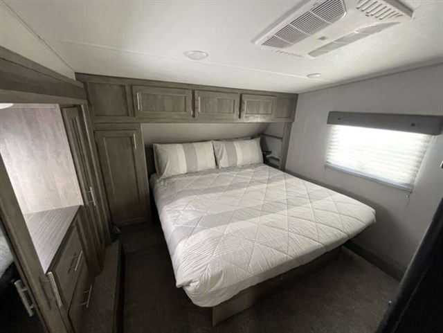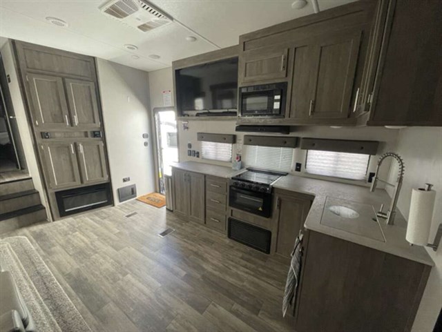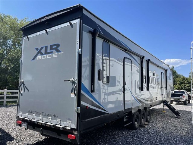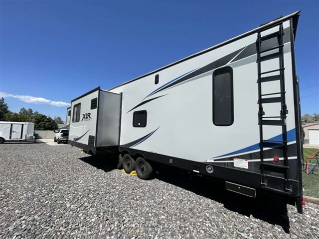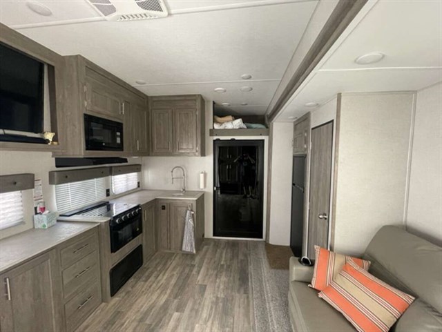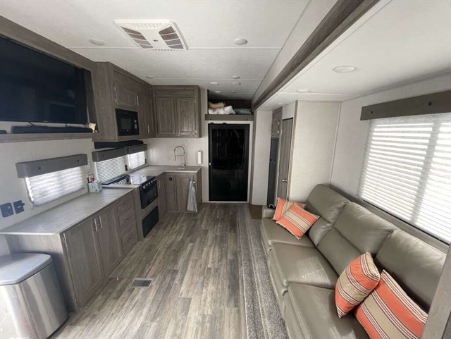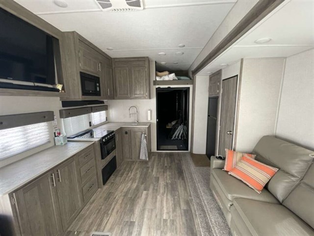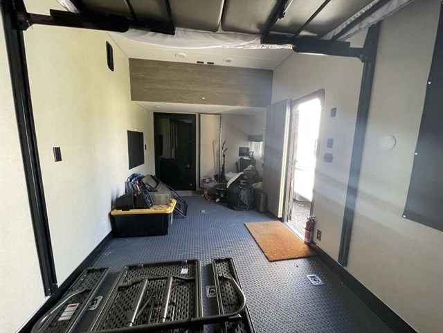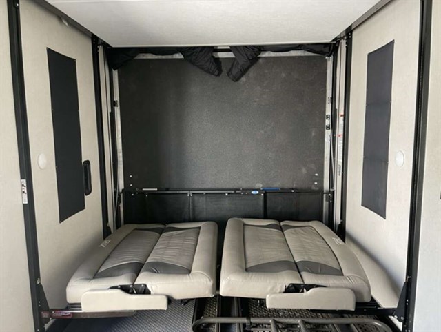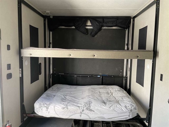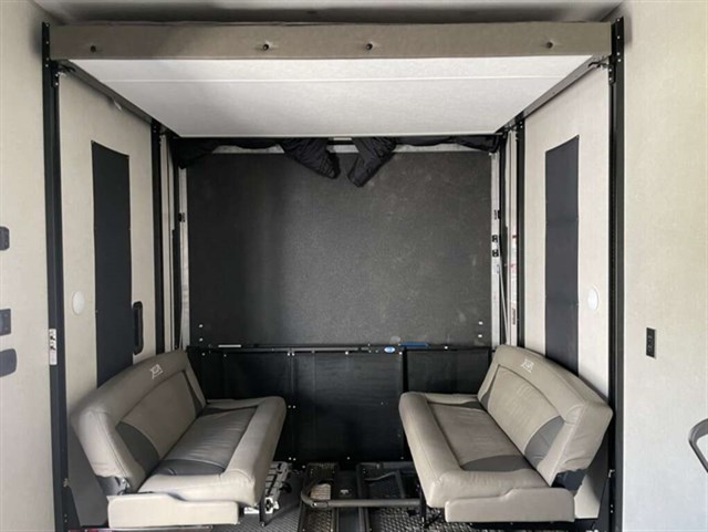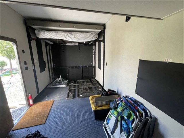 This trailer has been a great trailer. We have used it for 2 seasons and it hasn’t let us down once. It pulls great. Has a lot of storage for toys and everything else. I am able to fit a 4 seat turbo rzr and 2 motorcycles in the separate garage. It has 2 ac units which work great on those hot summer days. The 1 1/2 bath is nice to keep things clean inside the trailer. Has 100 gallon fresh water tank so you don’t have to worry about running out of water. The back ramp drops into a patio and screened railing comes out to keep the kids safe. In the garage are 2 beds or 2 couches and the top bunk can stay up if you want to use the couches and have plenty of overhead clearance. There is usb plugs throughout the trailer to make it easy to charge your phone. There is a nice tv and couches that recline, are heated, and have massaging in it. I am sad to get rid of it, but just looking at going a different route with the growing family.