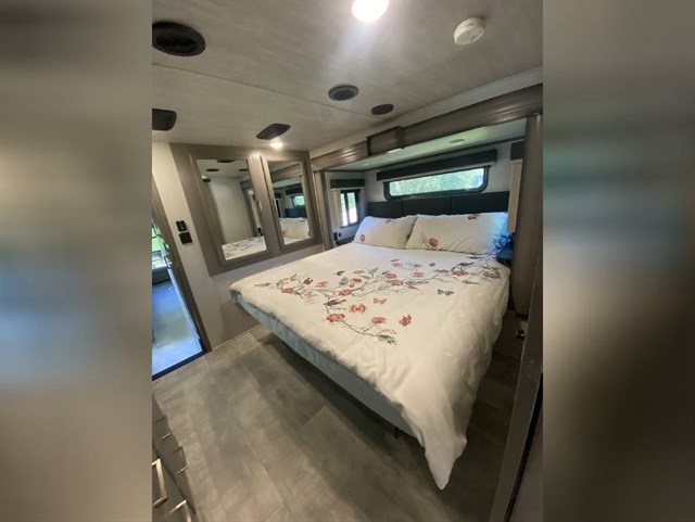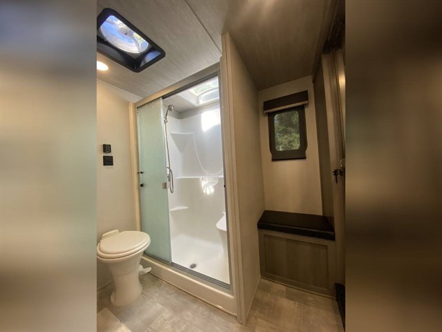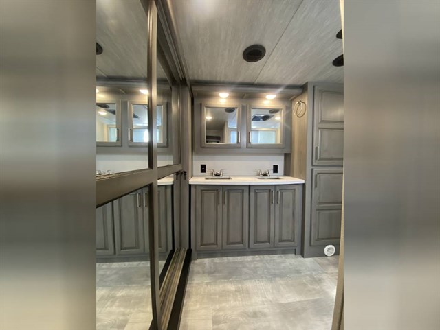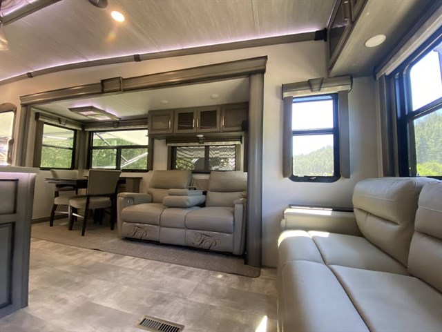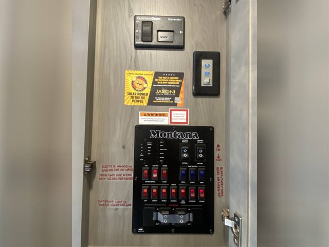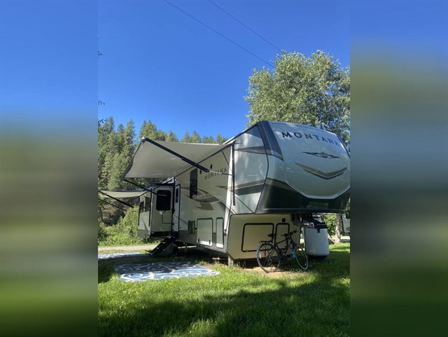 It's time to start living your traveling dreams in this Montana! Beginning with the master suite featuring a walk-through bedroom to the front luxurious bathroom with dual sinks, a shower with a seat, plenty of closet space along the front wall including shelves, and a bench seat offering you a space to put on your shoes. You will also find the half bath comes in handy when other campers visit. The main living space includes the kitchen amenities such as a coffee station, a closet prepped for a washer and dryer if you choose to add that option, and all the appliances necessary to live full-time in the fifth wheel. You can probably imagine relaxing at night in your own theater seat with power recliner or having a snack at the free standing dinette with movable chairs before you retire for the evening.