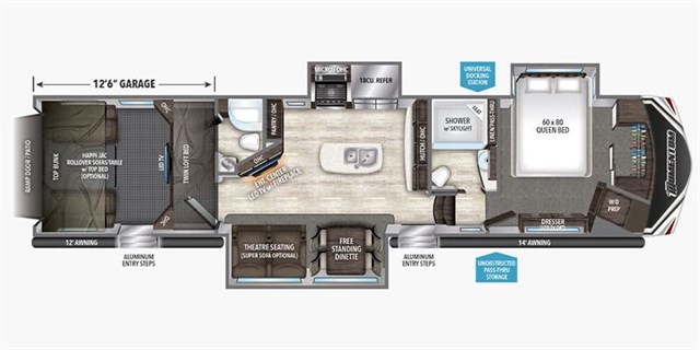 We’ve loved our Grand Design Momentum 397TH, but it’s time for a change! We have converted the garage into the master bedroom and the original master bedroom into kids’ room. The kids’ room has IKEA bunk beds and bin storage attached to the wall, TV, and Splendide stackable washer and dryer. The dining room table was changed to one which has worked better for our family of six, and the loveseat was changed to an IKEA leather Morabo loveseat. The garage Happijac was modified to accommodate a king mattress positioned North/South and has TV. The fridge is 18 cu ft gas/electric. This RV has two full bathrooms, two 30 gal gas tanks for toys and 5500 Onan generator. A 3-stage water filtration system has been added in storage bay, and there are two 30lb propane tanks. Splendide stackable washer and dryer included. “Molly” is 43.25ft in length and is missing part of the exterior side ladder due to a vinyl fence needing the ladder more than we did!