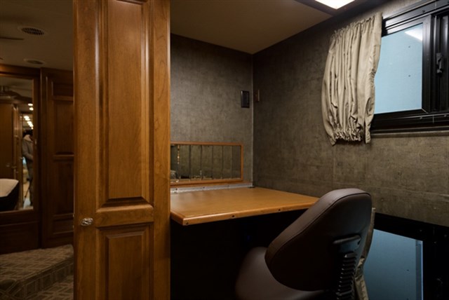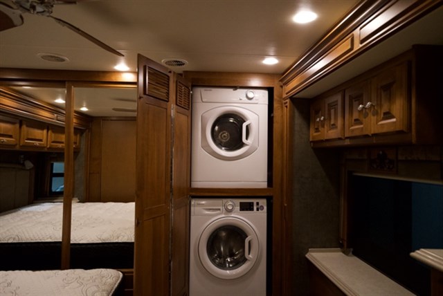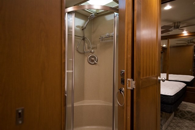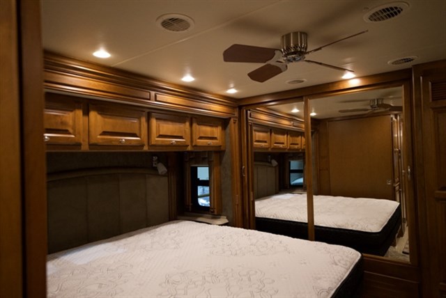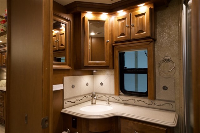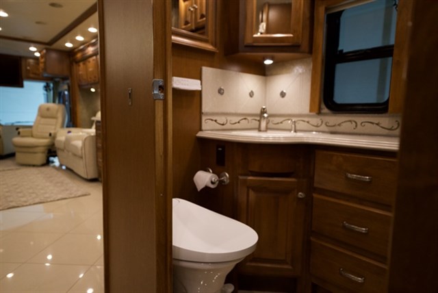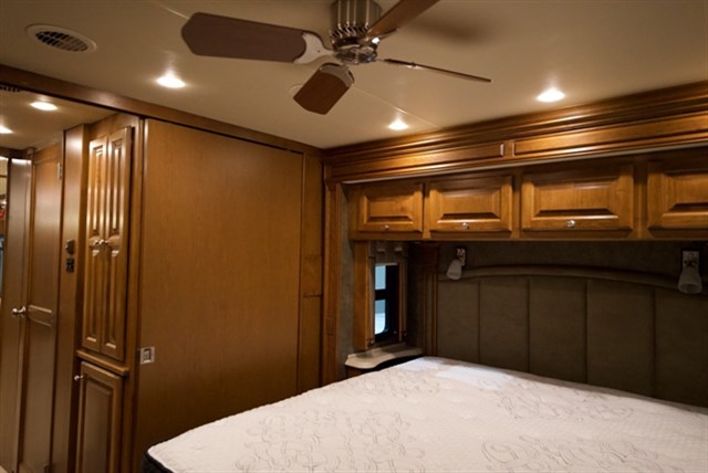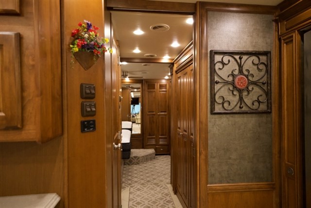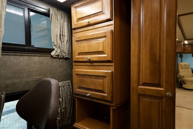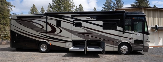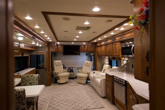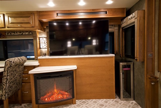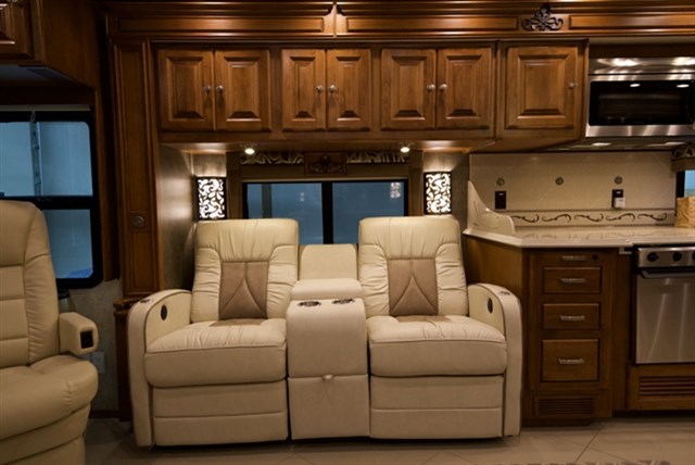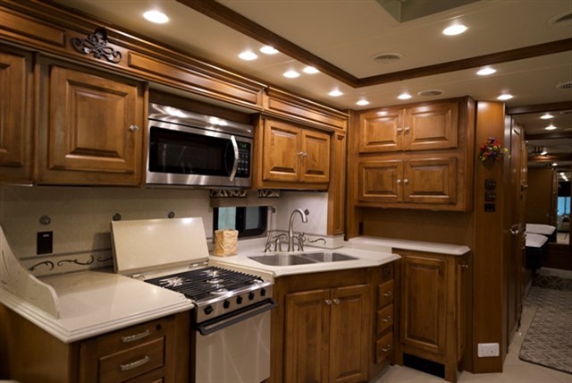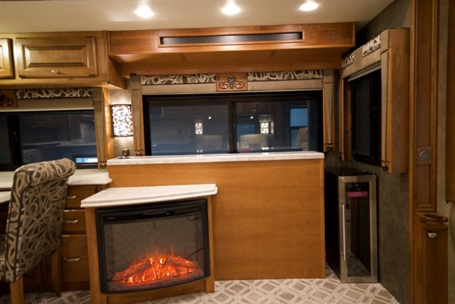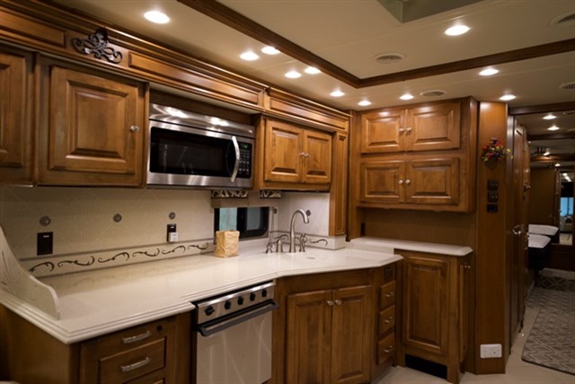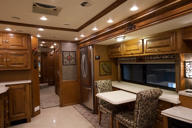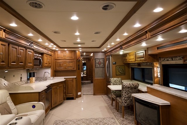7-foot ceilings, four slides, spacious living area. Expand-an-island, solid surface cooktop cover that folds down. Residential refrigerator. English chestnut cabinetry. Caviar interior color palette.