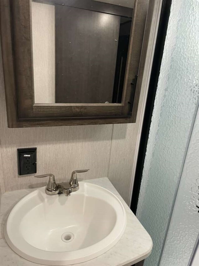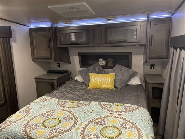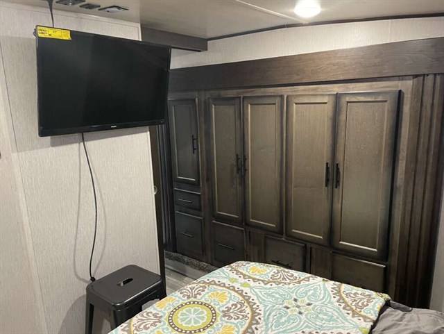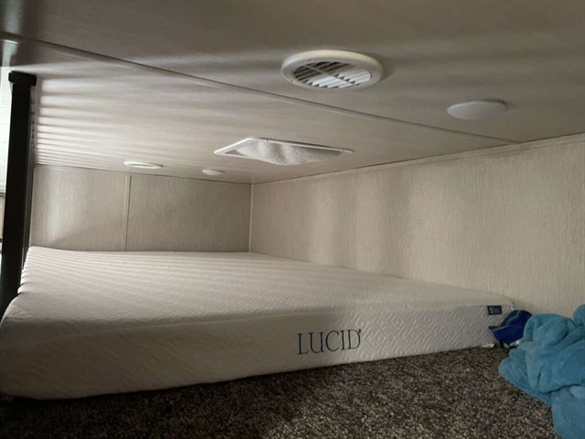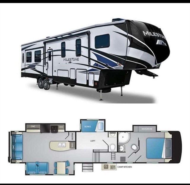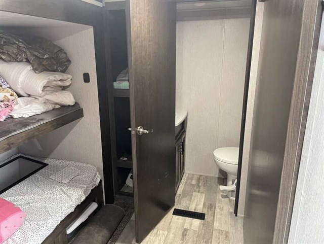 This is a mid bunk and has a half bathroom in the bunk. We upgraded it with an extra AC unit, solar panel w/ 40 amp charger, and the 6 point auto leveling system. Has the out door kitchen and fridge. It’s heated in the underbelly and hasn’t froze anything while camping in some good and cold hunting seasons. Tires are 12 ply and in good shape. This trailer pulls extremely well and has been an excellent camper. We used it a bunch in camp grounds for ball tournaments. We have just had kids grow up and move on and this is more than what we need now. Priced to move as you won’t find a trailer on a lot with all this has for the price.