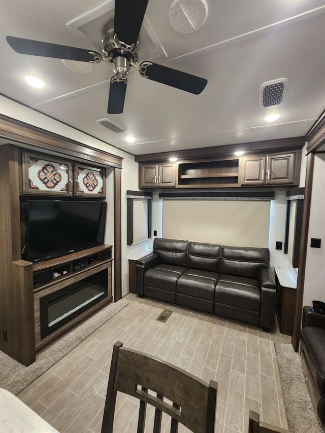 You will love having the freedom to comfortably enjoy destination after destination with this Avalanche fifth wheel! With a king-size bed in the front master suite, you will be able to drift off to sleep easily each night, and any guests that you have traveling along with you will also enjoy their rest on the hide-a-bed sofa in the rear living area. The fireplace will deliver a beautiful ambiance at night as you watch your favorite movie on the 50" LED TV, and everyone will appreciate the bright sunshine that streams through the shower skylight each morning.