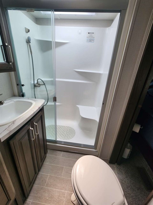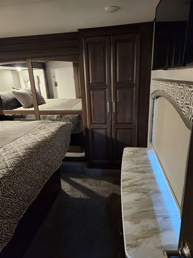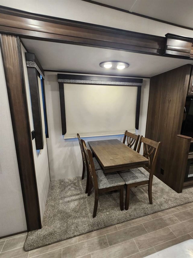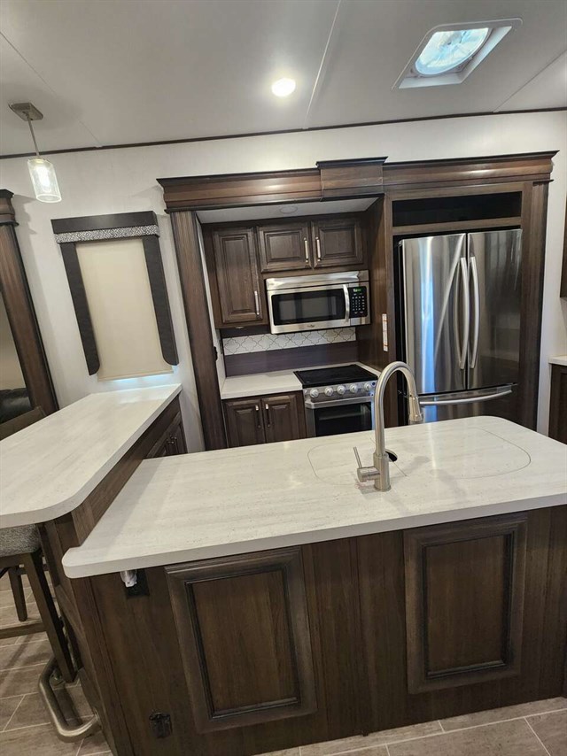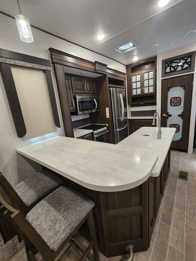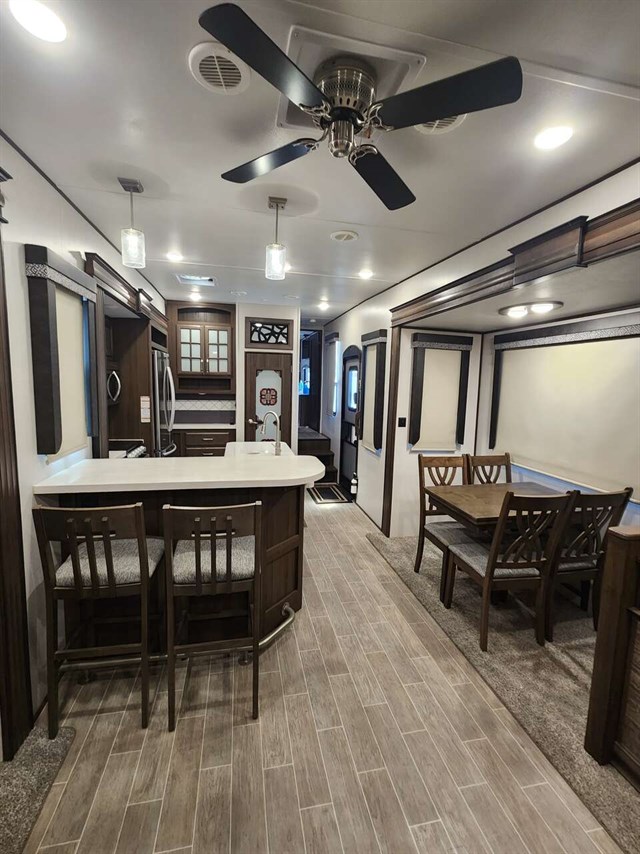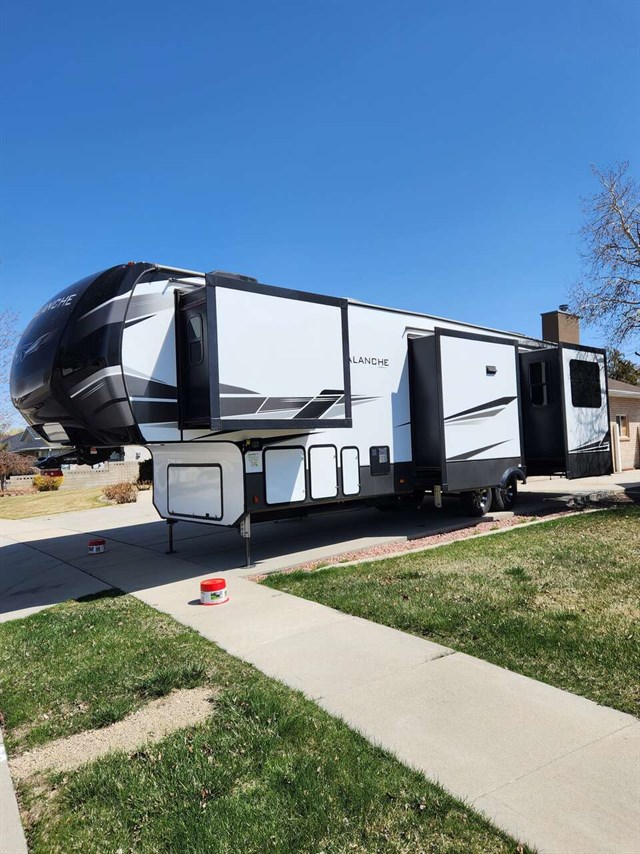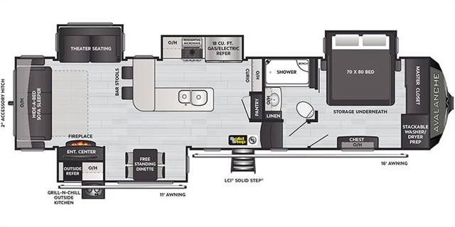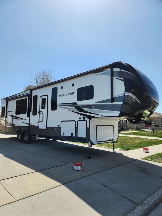 With any Keystone Avalanche fifth wheel, you will enjoy getting to your favorite destination with the exceptional turning radius from the MAX TURN high-gloss fiberglass front cap, as well as the Road Armor suspension. Once you have arrived at your destination, the One Place Command Center with its centrally located operational switches and gauges will allow you to set up your RV quickly, and the one-touch electric awning with adjustable arms will provide protection from the sun and weather while you load your clothing, dishes, and gear into all of the interior storage compartments.
