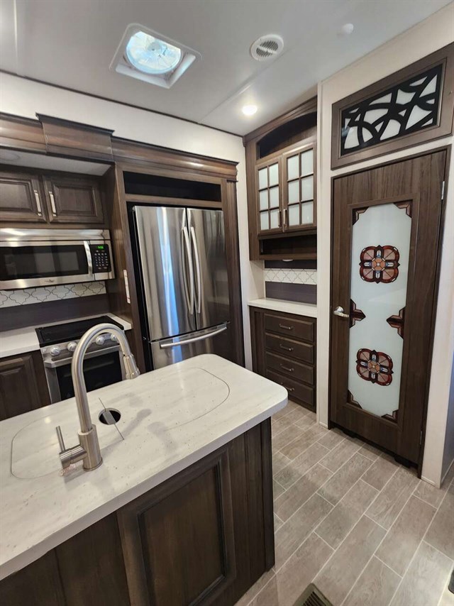 Outside Breakfast Nook with mini fridge, stove and storage cabinets Large pass-thru storage compartment