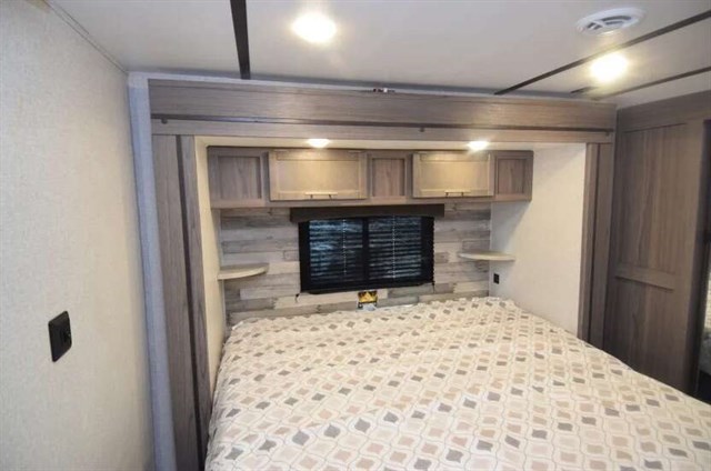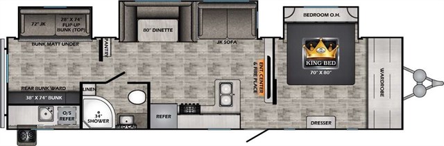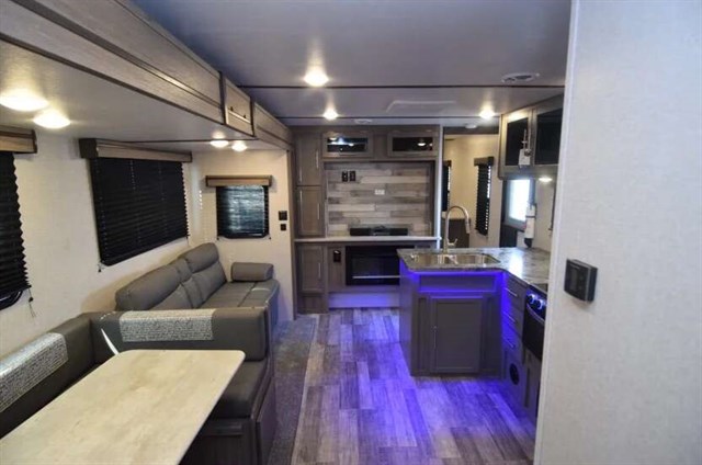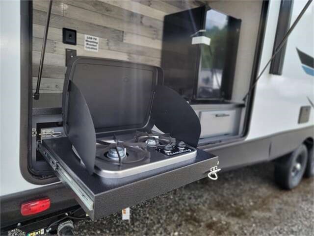 Get ready for fun camping trips in this spacious travel trailer. The private bunkhouse will be perfect for guests that tag along, and the full bath is close by for convenience. You and your spouse will have the front private bedroom with a king bed, a dresser, and a large front wardrobe. Everyone can gather in the main living area to dine around the U-shaped dinette or relax on the jackknife sofa, and the fireplace will make it feel more like home. The chef of your group will love making breakfast at the outdoor kitchen, and the power awning will provide protection from the elements.