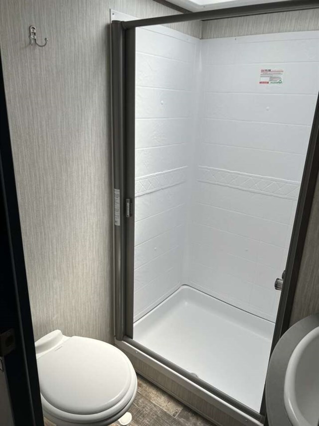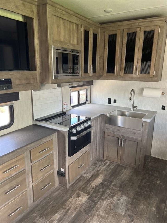 Every Sabre SS150 fifth wheel by Forest River allows the driver to enjoy moving around town and parking at the campsite with the Turning Point "90 degree-plus" turning radius hitch, the LCI "Revolution" lightweight technology I-beam, and the Generation III electric auto-leveling system. Inside you will be able to keep all the electronics charged with the double high output USB charging ports in the nightstands, bunks, kitchen and end tables. And the chef will enjoy cooking on the commercial grade range with ambient lighting control, and storing items in the "Lock-Tite" wood core cabinetry, plus the industry leading, campsite-view, panoramic slide windows will give everyone nature's best views!