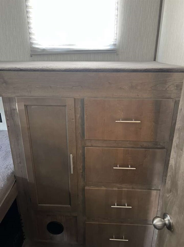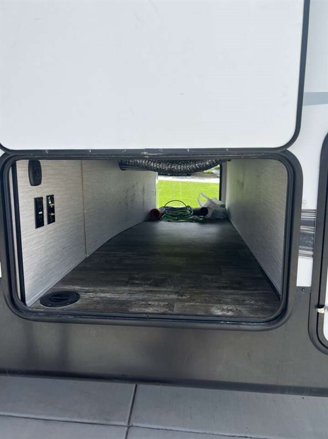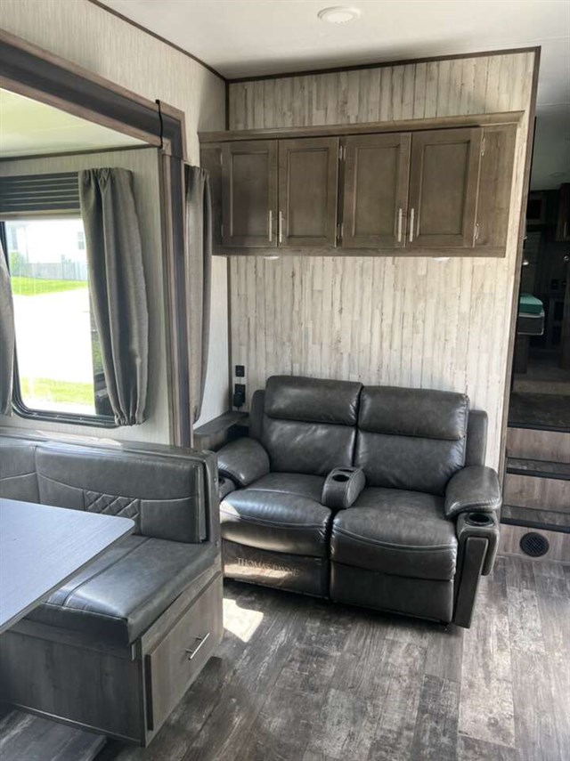 Scenic views, a full kitchen and bathroom amenities, triple bunk beds to sleep four tired campers, and a master suite to retreat to after a fun day outdoors, sounds like a good time! The hardest decisions you will have to make is if you want to cook inside or outside, to relax on the Cinemax theatre seating with heat and massage, or sit outdoors under the power adjustable awning, and what your next adventure will be. This fifth wheel even has plenty of storage under the dinette seats, in drawers under the bunk, in shirt closets, and inside overhead cabinets, plus the exterior open pass-through storage can hold those larger camping items.