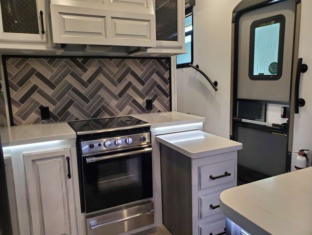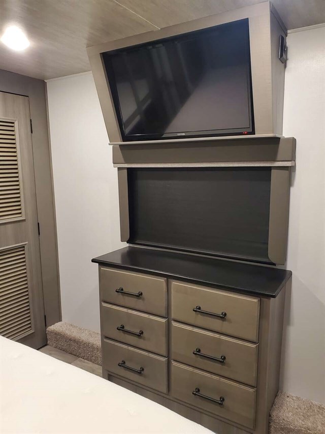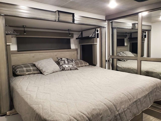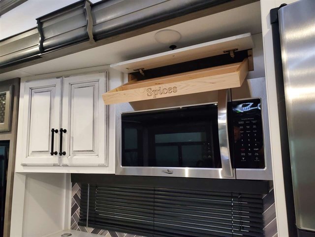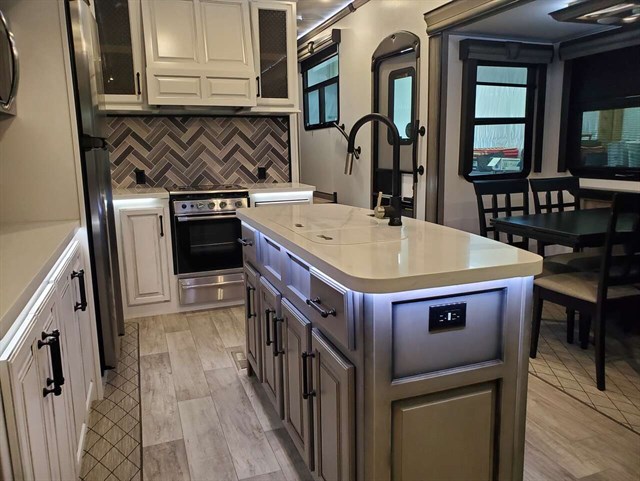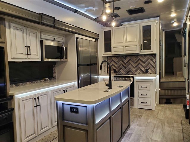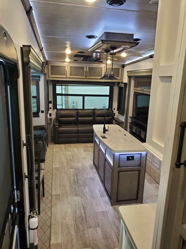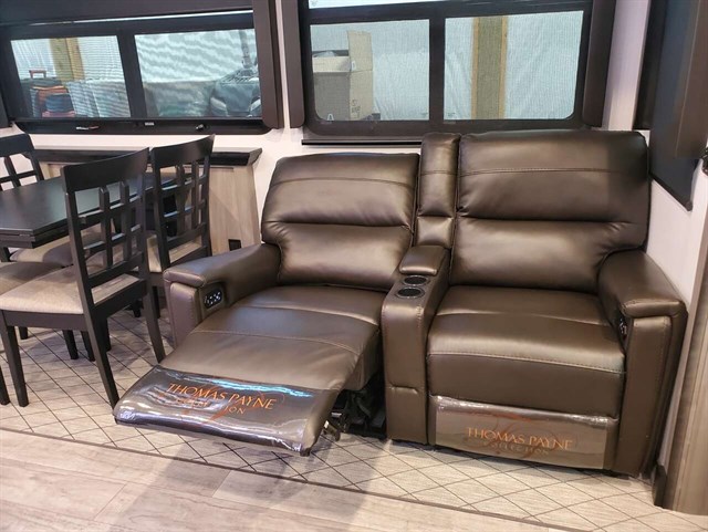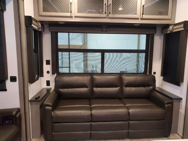 Luxury abounds throughout this fifth wheel! Starting in the kitchen with the island, two pull out pantries with extra countertop space above it, a glass top upgraded range, pull-down spice rack, a pull-out countertop for more prepping space. The full bathroom has a 48" x 30" fiberglass shower with a seat, decorative glass enclosure, and skylight above it for more natural lighting as two get ready at once with the dual sink vanity. Sleep like a baby in the front private bedroom on the upgraded king bed mattress with storage underneath and keep your clothes looking their best with the front closet that has a clothing hamper and an area prepped to add the optional stackable washer and dryer. The rear living area offers true relaxation with a hide-a-bed sofa and power Thomas Payne theater seating across from the entertainment center with a 5,000 BTU decorative fireplace heater and 50" LCD HDTV, surround sound and added Sony Blue-ray DVD player, to watch your favorite movies!