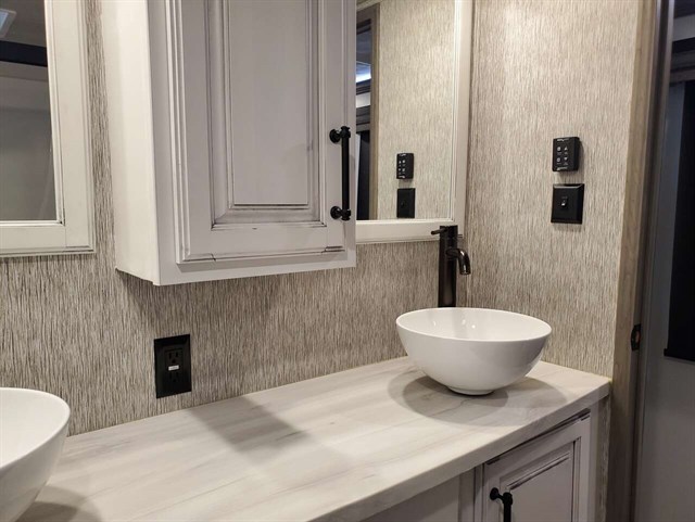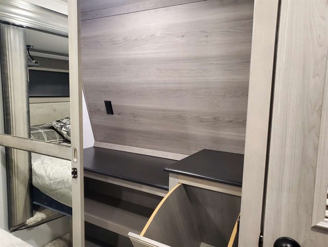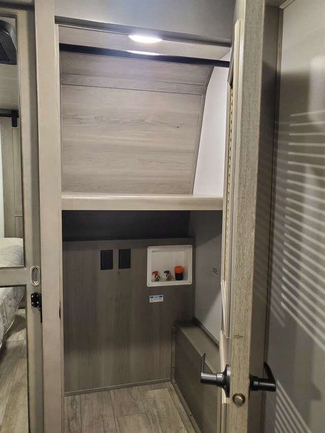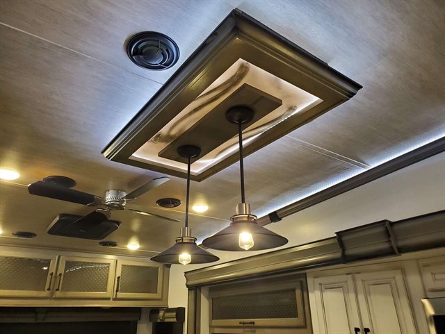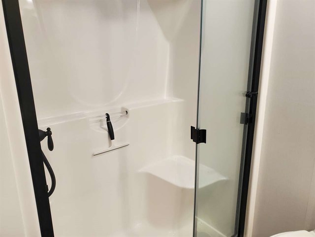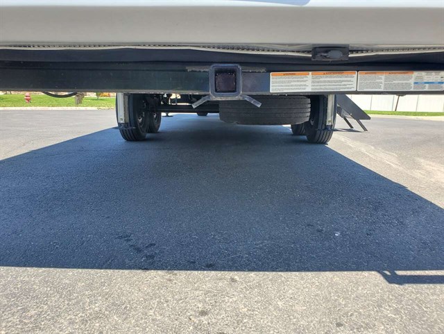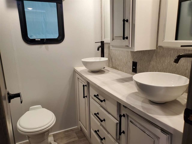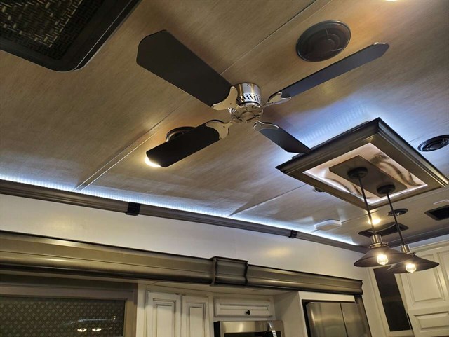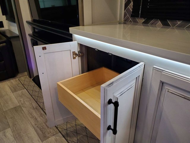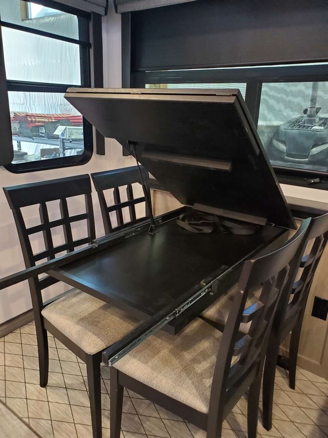 Luxury abounds throughout this fifth wheel! Starting in the kitchen with the island, two pull out pantries with extra countertop space above it, a glass top upgraded range, pull-down spice rack, a pull-out countertop for more prepping space. The full bathroom has a 48" x 30" fiberglass shower with a seat, decorative glass enclosure, and skylight above it for more natural lighting as two get ready at once with the dual sink vanity. Sleep like a baby in the front private bedroom on the upgraded king bed mattress with storage underneath and keep your clothes looking their best with the front closet that has a clothing hamper and an area prepped to add the optional stackable washer and dryer. The rear living area offers true relaxation with a hide-a-bed sofa and power Thomas Payne theater seating across from the entertainment center with a 5,000 BTU decorative fireplace heater and 50" LCD HDTV, surround sound and added Sony Blue-ray DVD player, to watch your favorite movies!