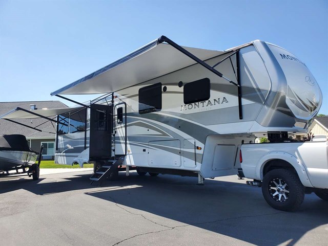 Take charge of how you camp in one of these luxurious Keystone RV Montana fifth wheels! The high-quality Solar Flex 400i delivers an affordable solar energy system that eliminates guesswork and may be built on to meet your exact needs. Keystone's exclusive 12" I-beam chassis with z-frame technology has been reengineered to be stronger, lighter, and built for "the long haul". A few other construction features you will appreciate include a Road Armor suspension, 2" thick CNC routed, dual-layered lauan high gloss fiberglass sidewalls, a Max Turn front cap with KeyShield automotive-grade paint, and a fully walkable roof with an Alpha seamless TPO membrane system. Their strikingly stylish interiors are designed with beautiful maple hardwood cabinetry, a pull-down spice rack, and an indoor/outdoor central vacuum, plus 2 Blade Pure airflow systems for clean, quiet, and cool air!