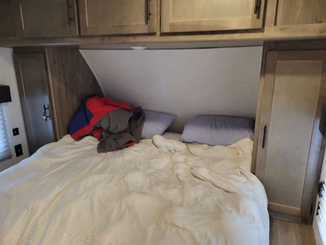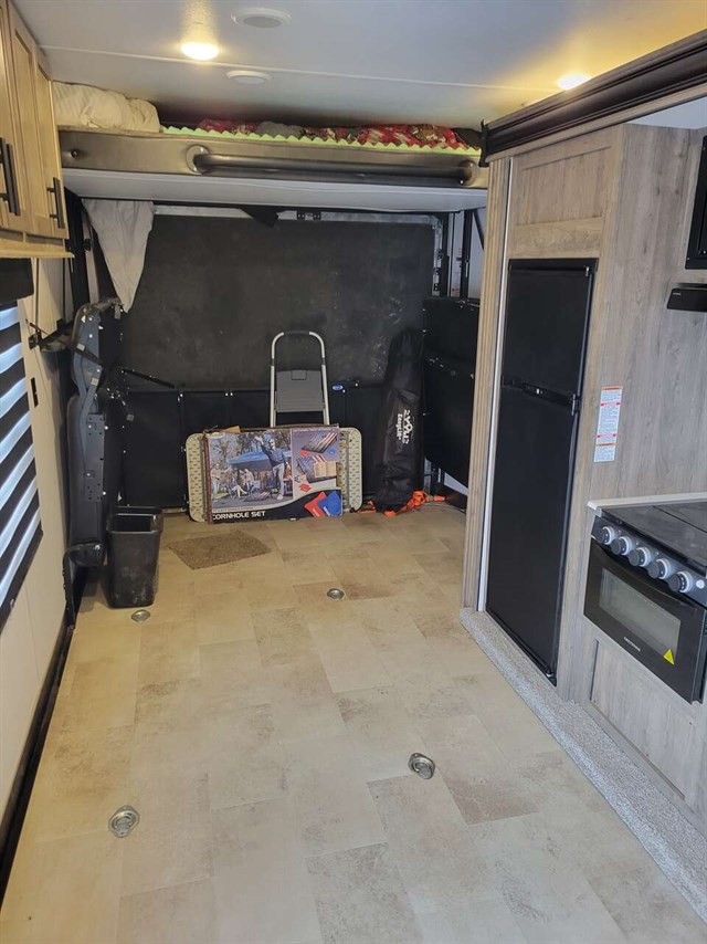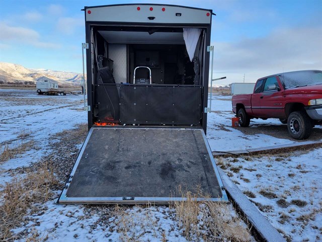 Used 6 or 8 times. garage will fit a 4 seater razor. 30 gal on board fuel station. 100 gal fresh water. Yamaha on board generator. Rear ramp makes into deck with railing. Pull down bunk and benches fold out into another bed. Queen bed at the front. Very nice trailer like new.