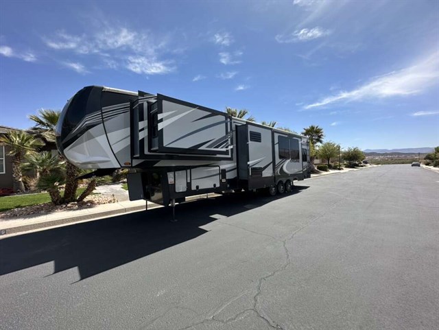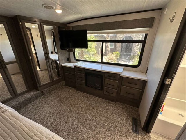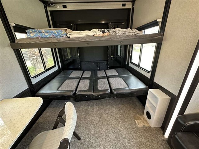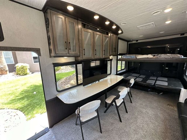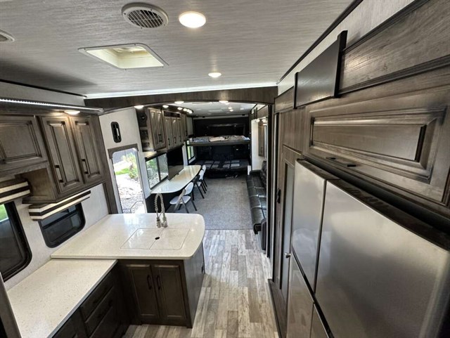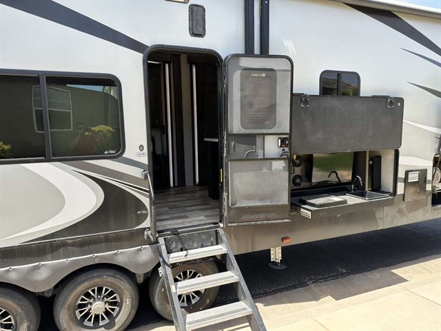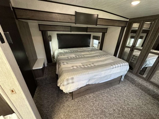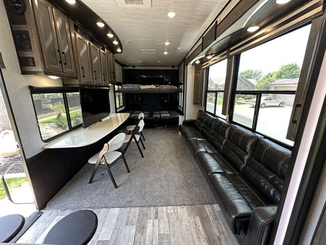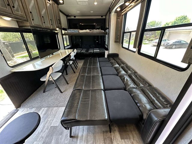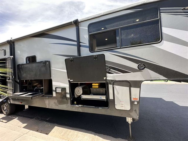 This trailer is in near perfect condition. It is an open floor plan with a 20ft garage. It has a double telescoping slide out in the master bedroom. This is a discontinued floor plan. Very hard to find.