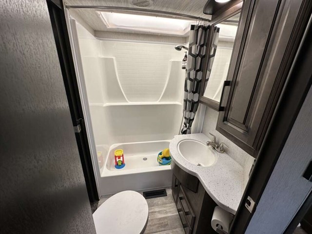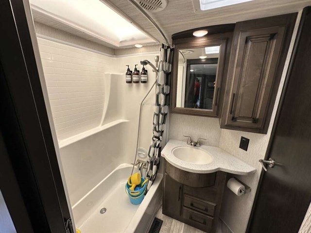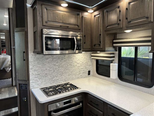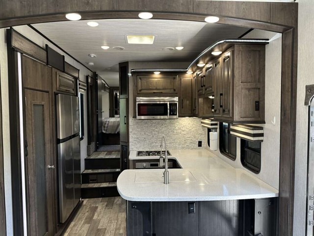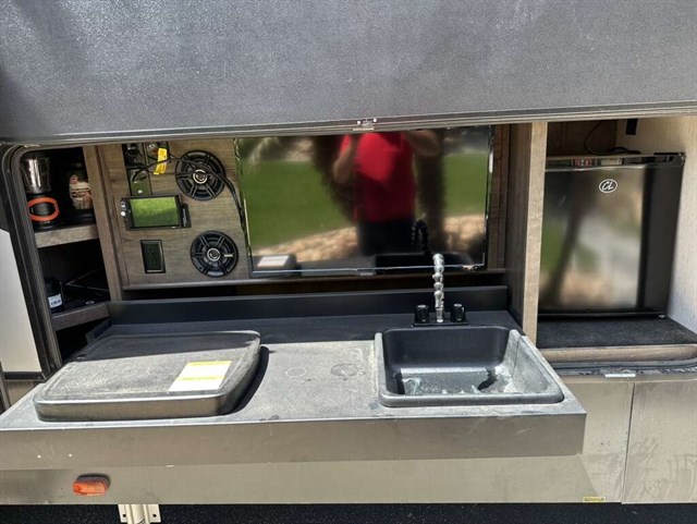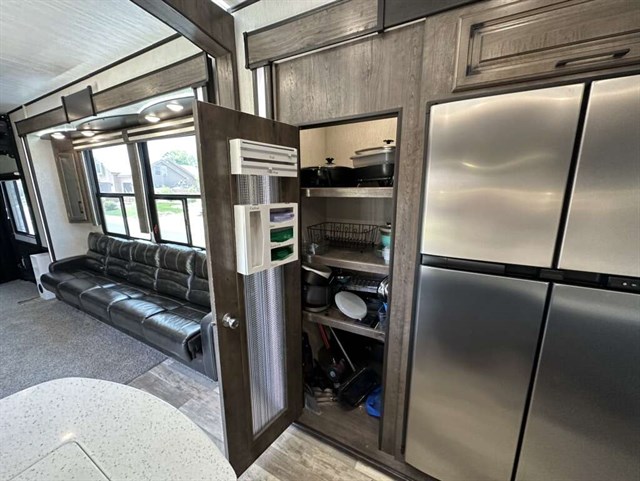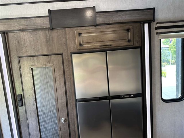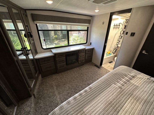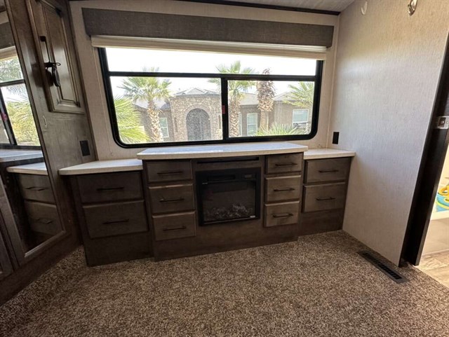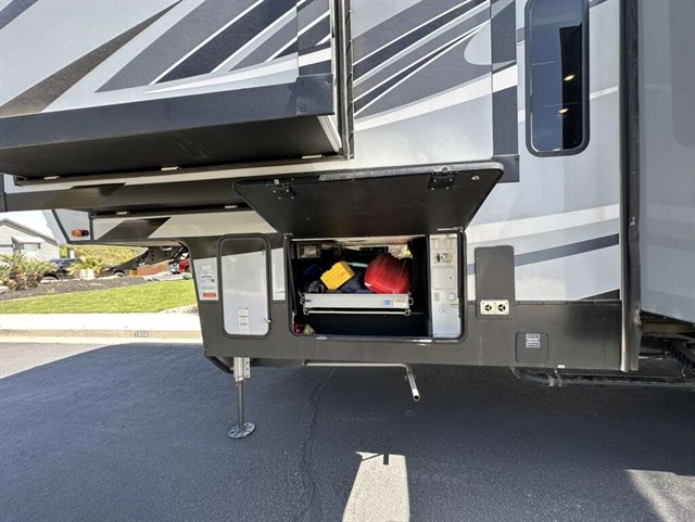 This trailer is in near perfect condition. It is an open floor plan with a 20ft garage. It has a double telescoping slide out in the master bedroom. This is a discontinued floor plan. Very hard to find.